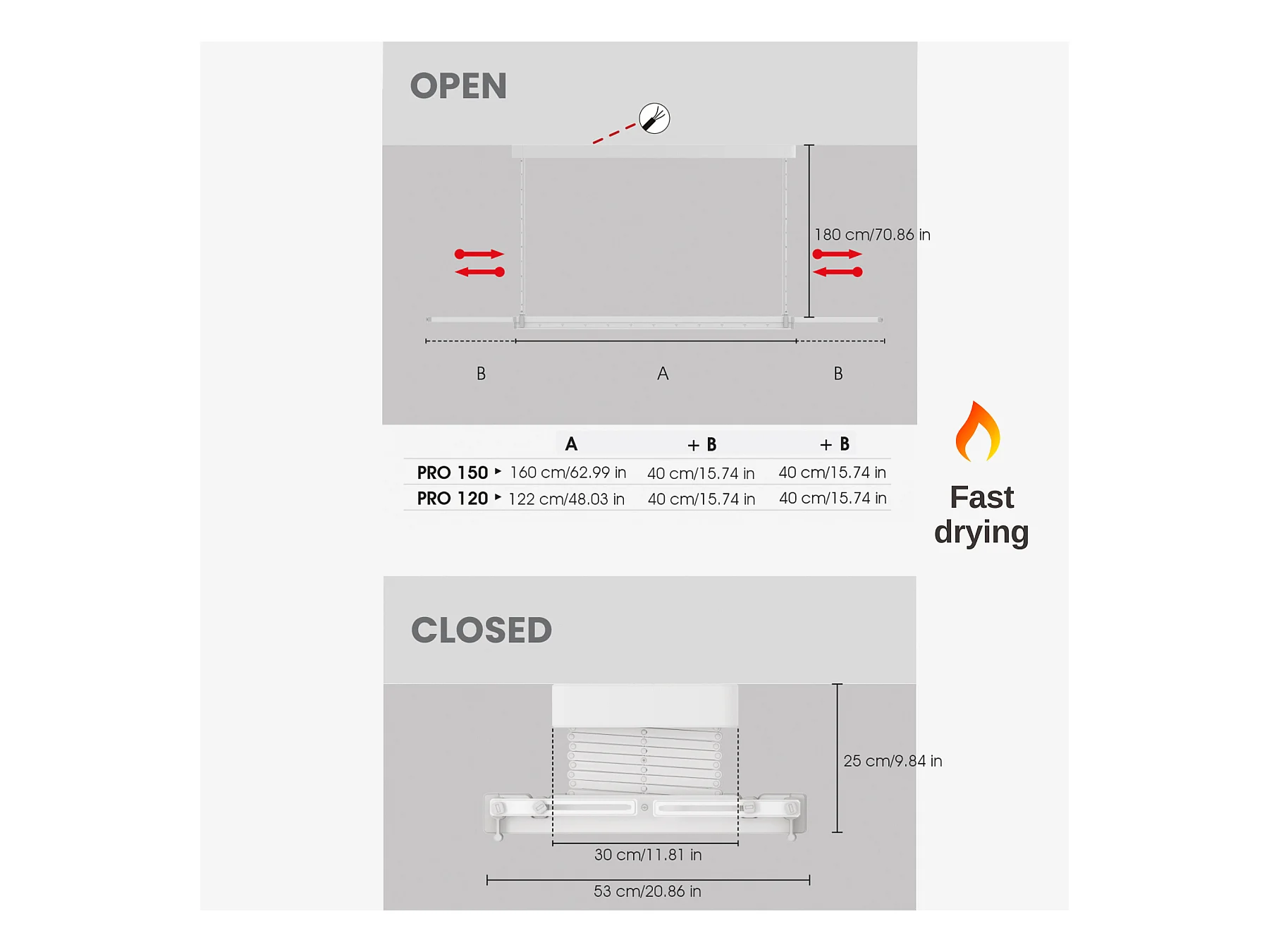Séchoir électrique de plafond avec télécommande – gris – 160x52x30 cm PRO 150