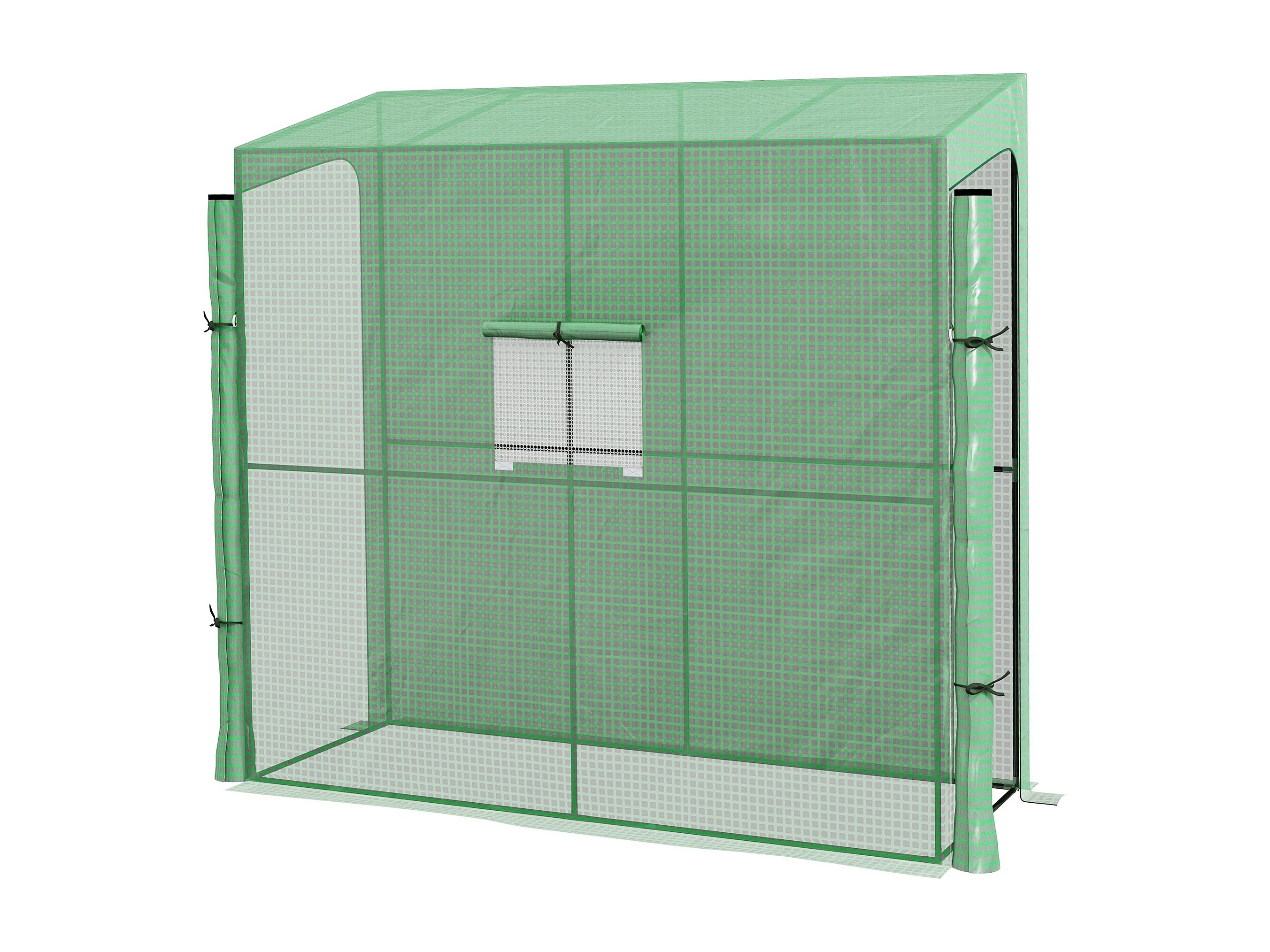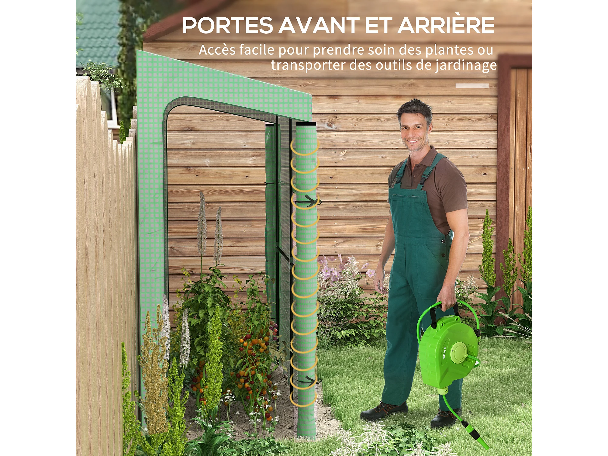Serre de jardin adossée serre adossée dim. 2L x 1l x 2,13H m 4 étagères 2 portes zippées 1 fenêtre acier PE haute densité vert