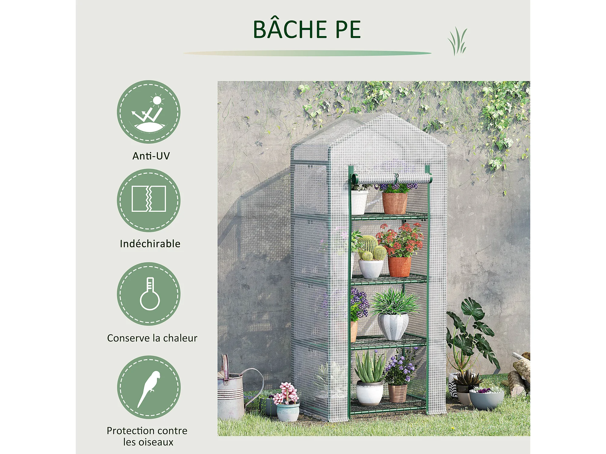 Serre de jardin balcon 3 niveaux métal thermolaqué vert PE blanc