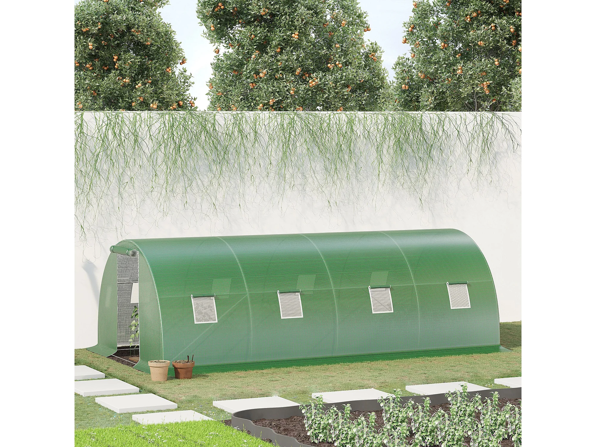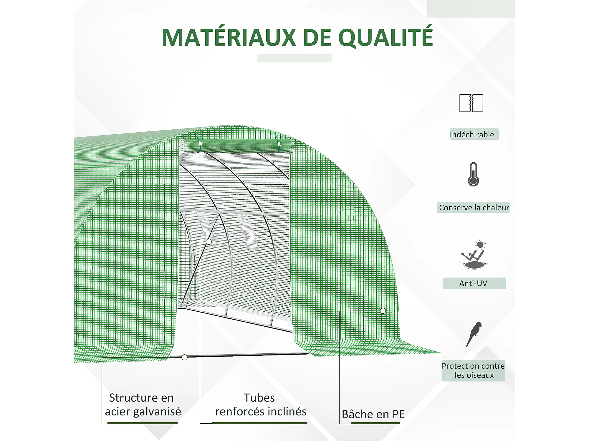 Serre tunnel grande taille 24 m² châssis tubulaire acier galvanisé renforcé 2,4 cm 12 fenêtres 1 porte vert