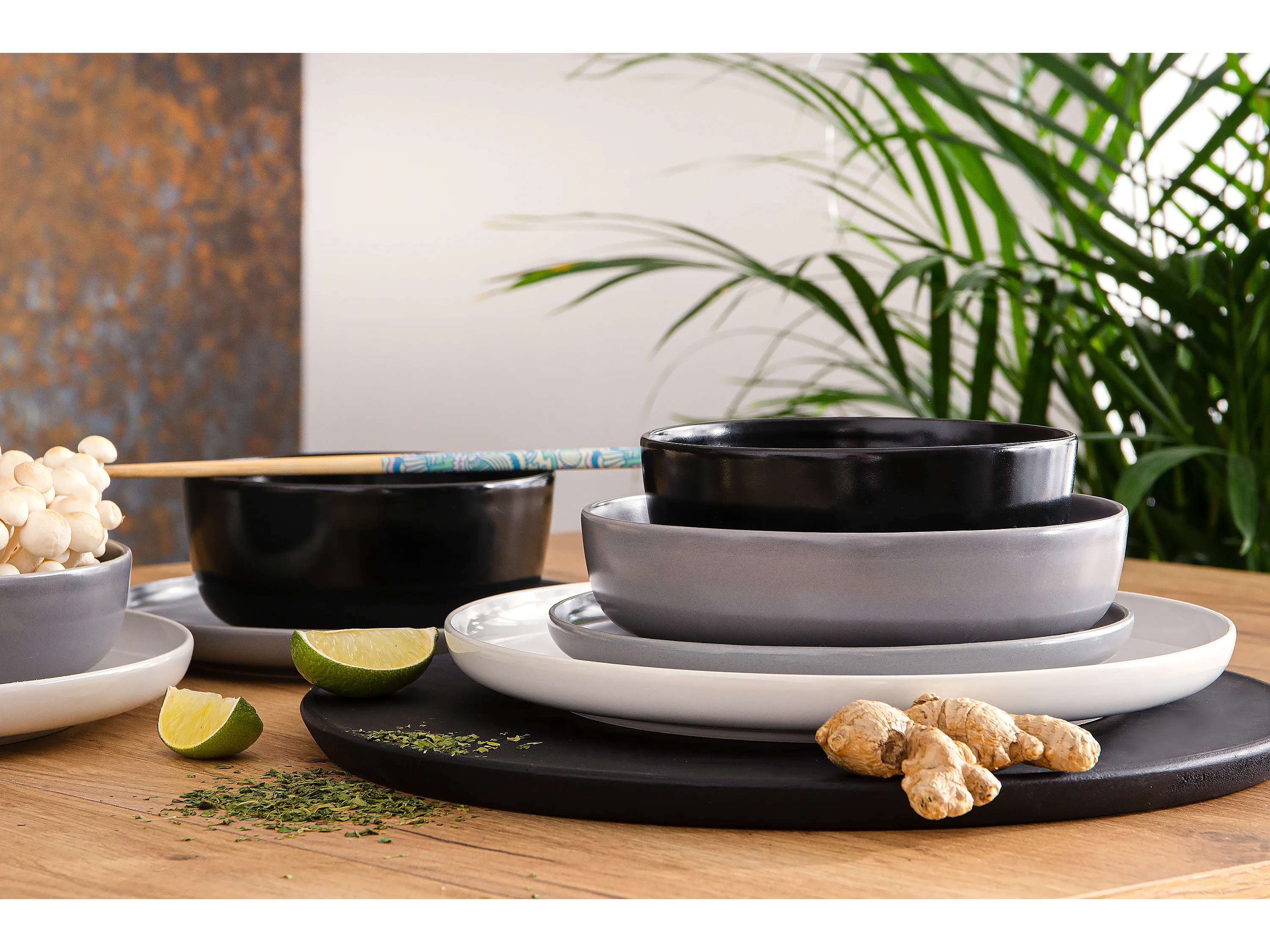 Service de table - Service vaisselle - avec Bol 18 pièces - Blanc, Noir, Gris - VICTO