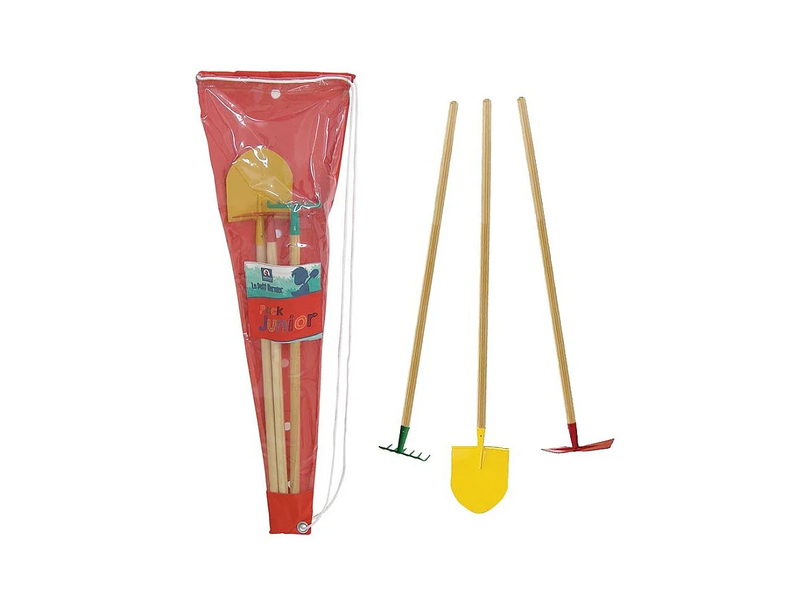 Set 3 outils de jardin enfant + sac de transport Pelle + râteau + pioche