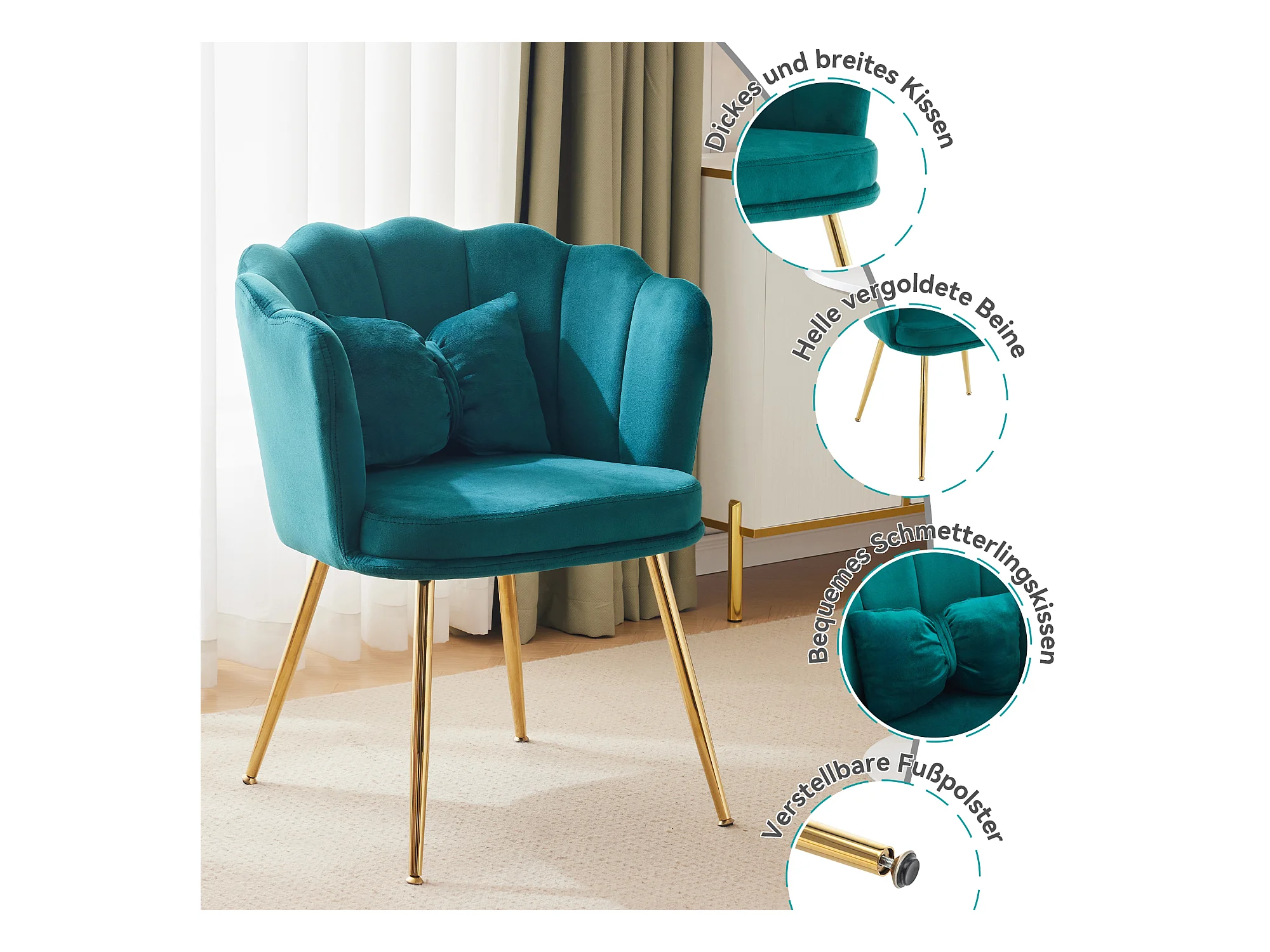 Set de 2 chaises modernes en velours, design à dossier en pétale, coussin lombaire papillon, pieds métalliques dorés, vert (63x58x77 cm)