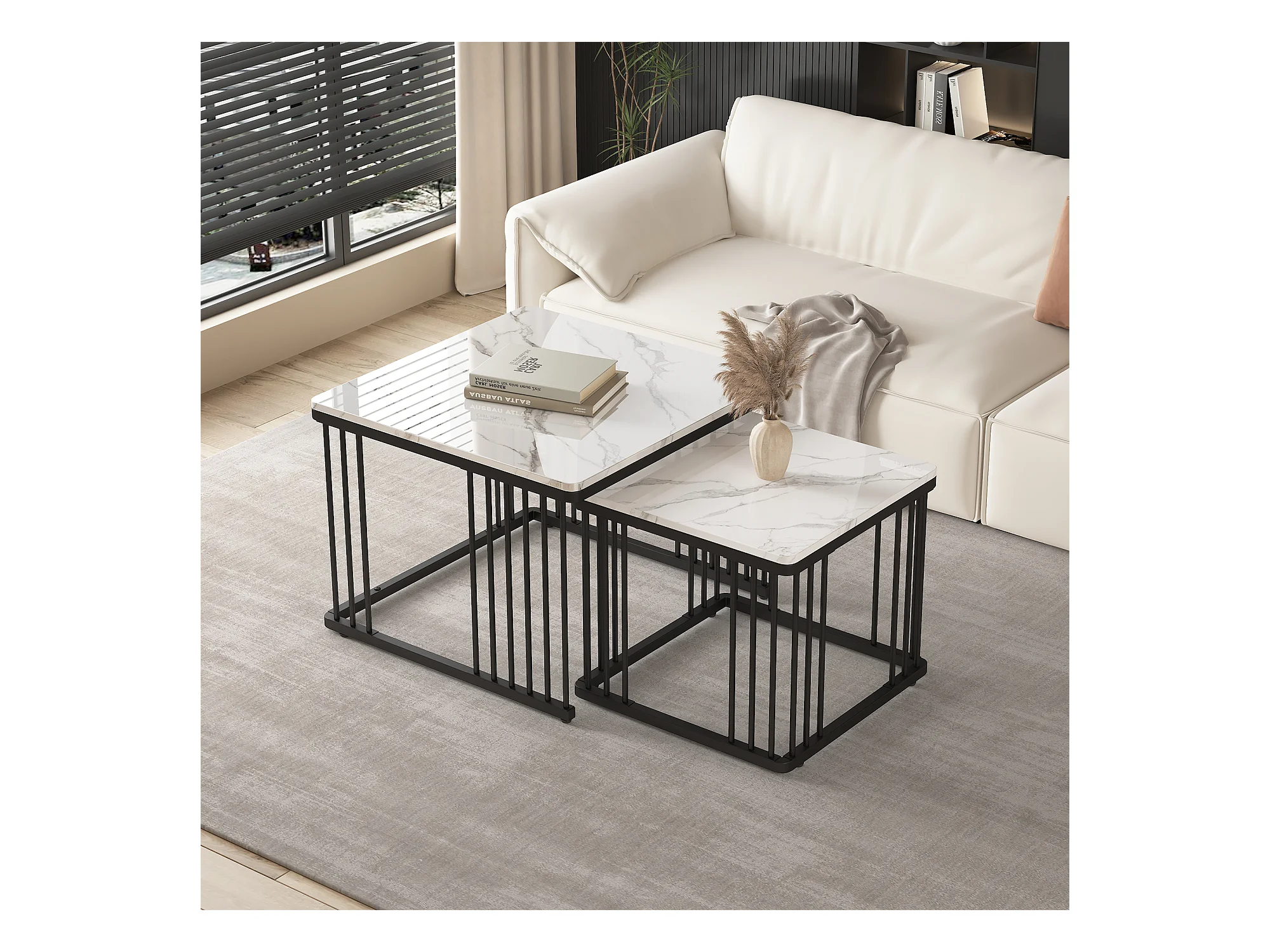 Set de 2 tables basses carrées, finition marbre brillant, pieds réglables, MDF, blanc (60x60x45cm & 45x45x40cm)
