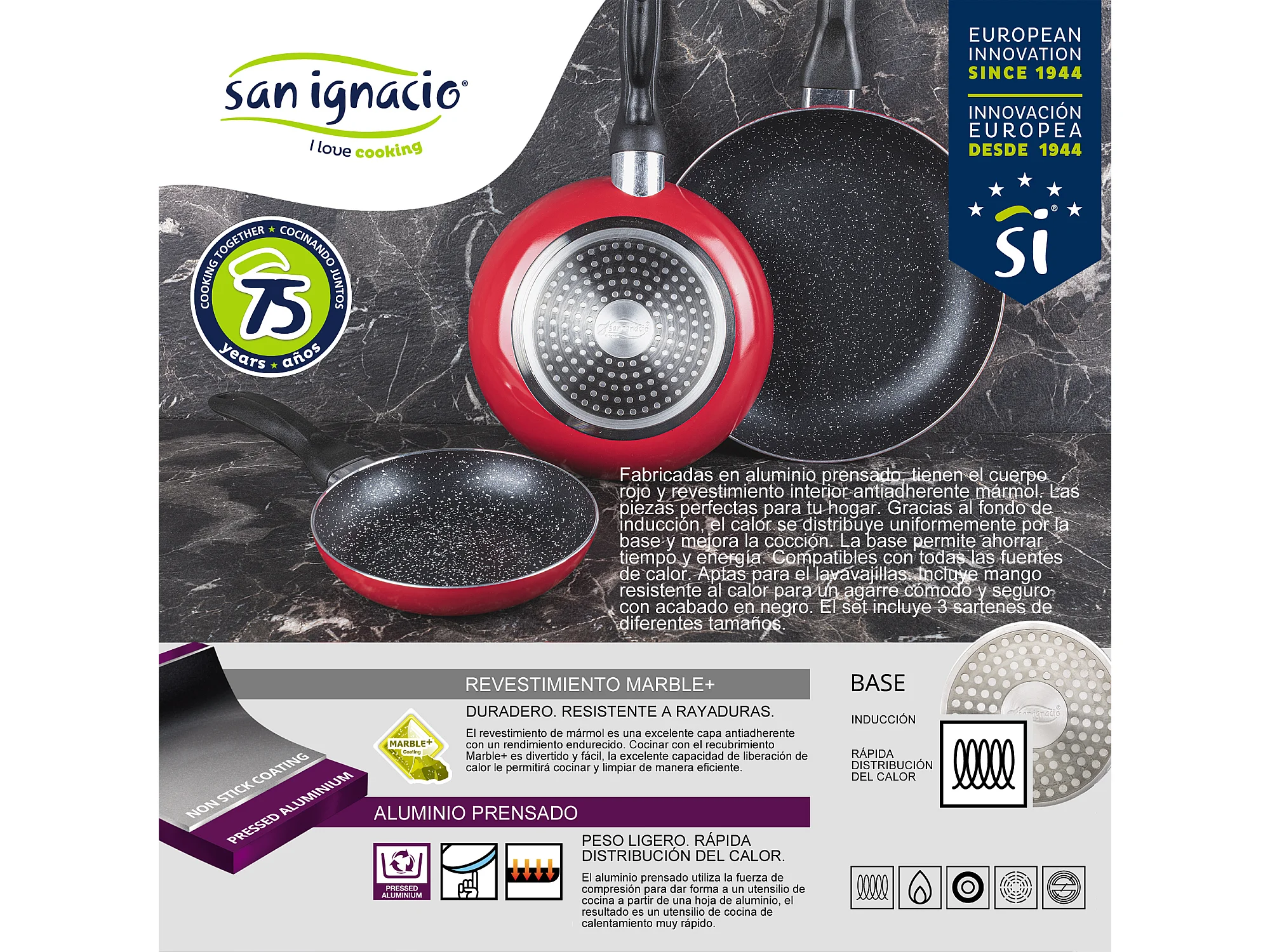 Set de 3 poêles avec revêtement en marbre ø16 cm ø20 cm ø24 cm ø24 cm