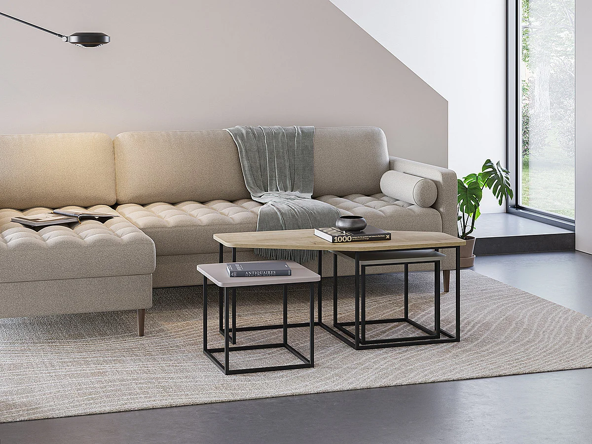 Set de 3 tables basses, tables de salon aspect bois coloris chêne, crème, vert et pieds en métal noir