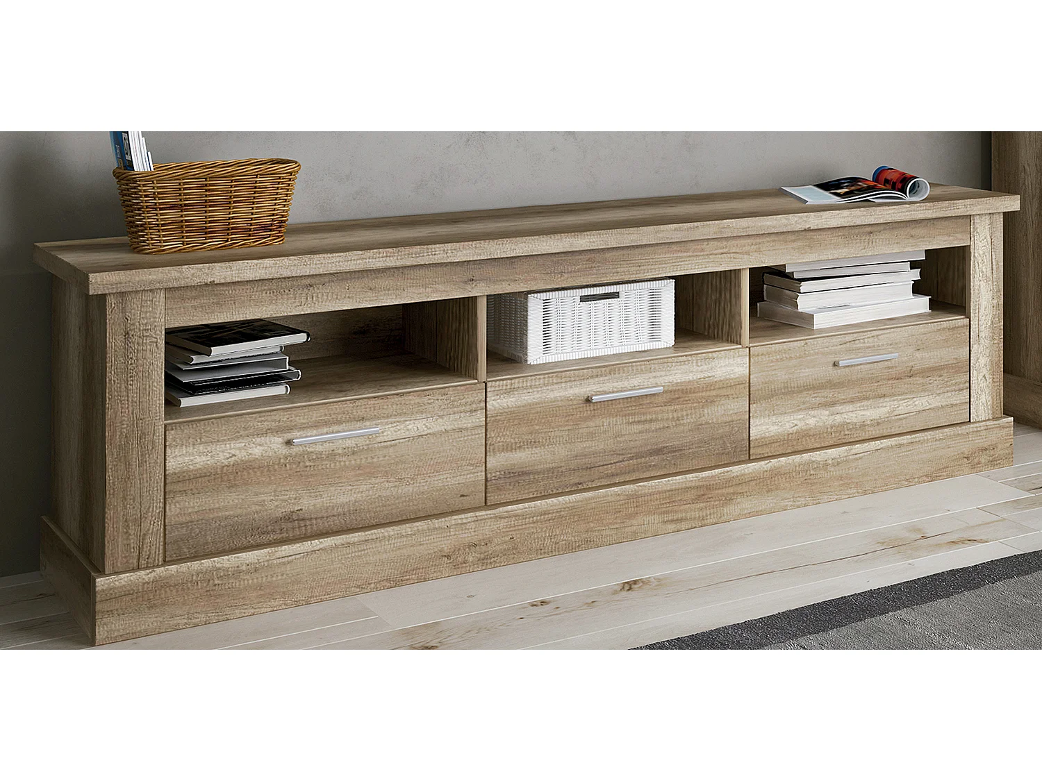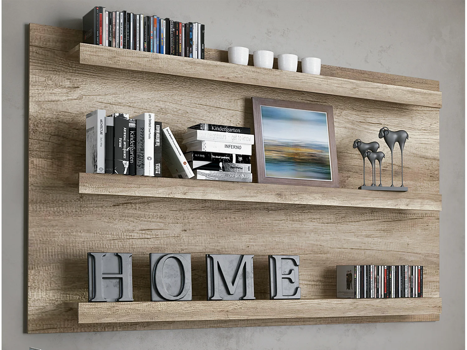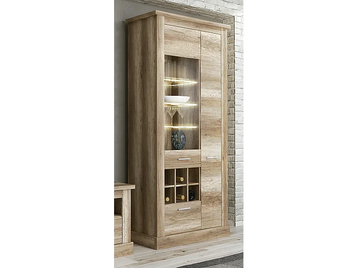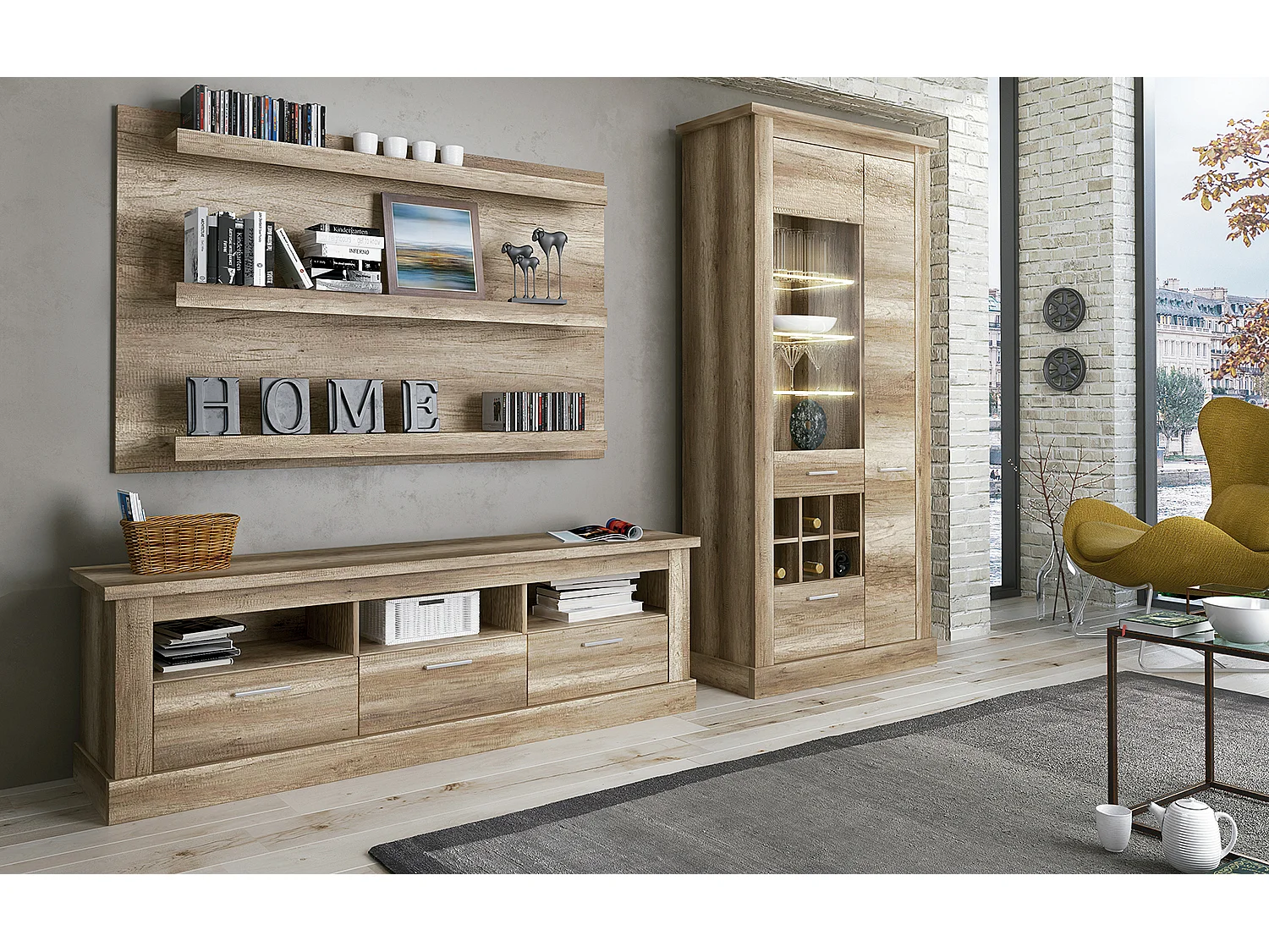 Set de salon, meuble TV + 3 étagères murales + vitrine coloris chêne vieilli