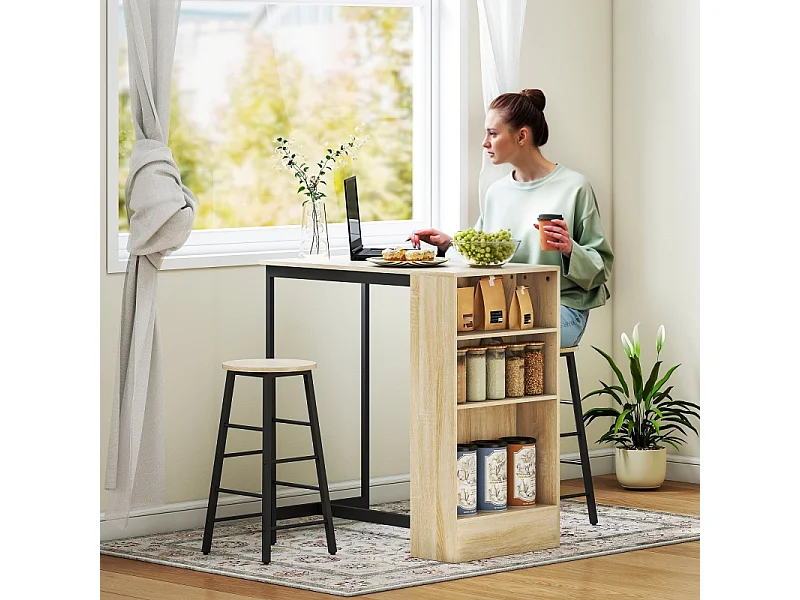 Set de table de bar avec 2 tabourets, avec rangement, acier, bois, blanc (91x49x91 cm)
