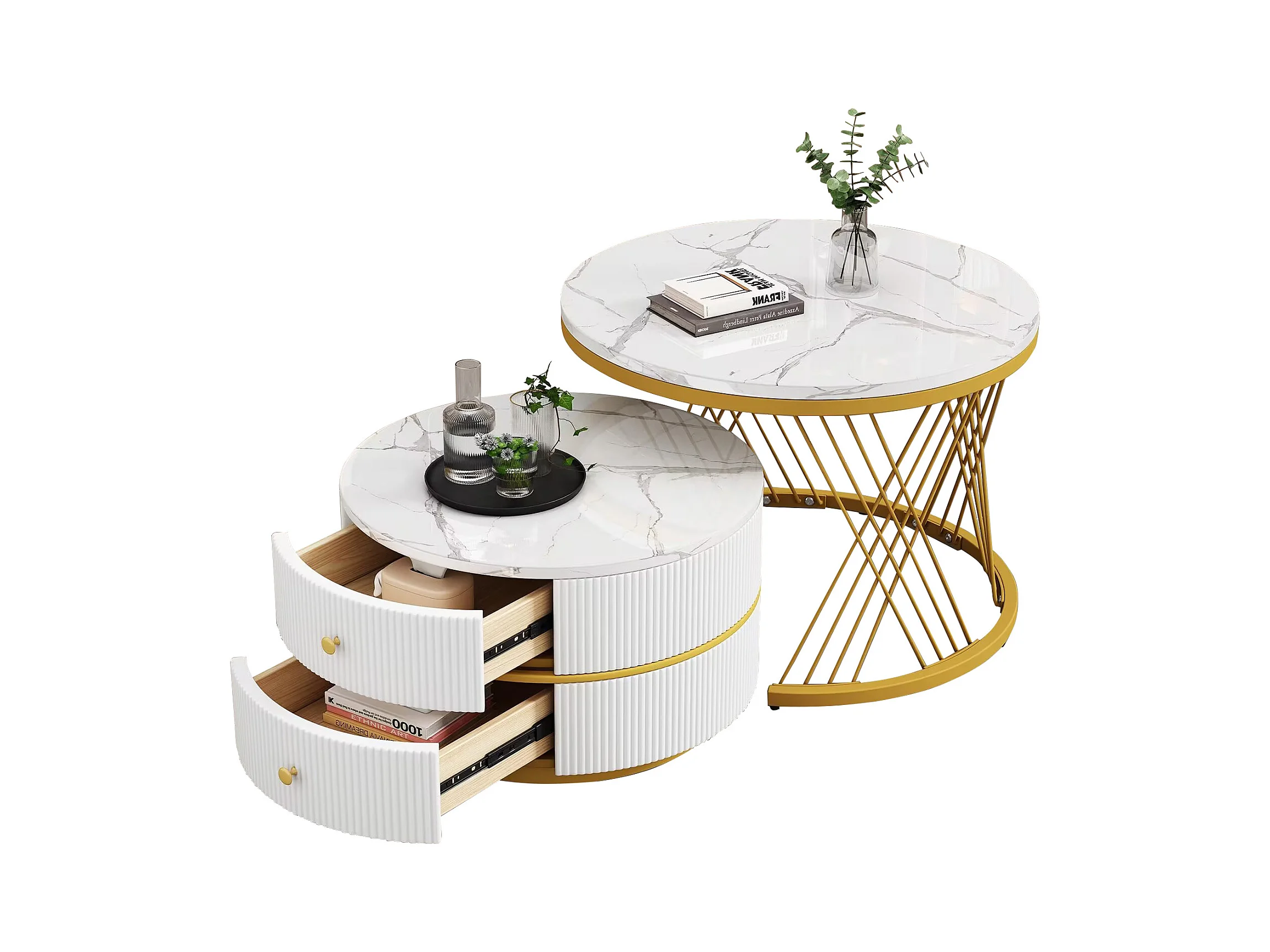 Set de tables basses empilables 2 pièces, design élégant, finition effet marbre brillant, 2 tiroirs, capacité de charge jusqu'à 30 kg