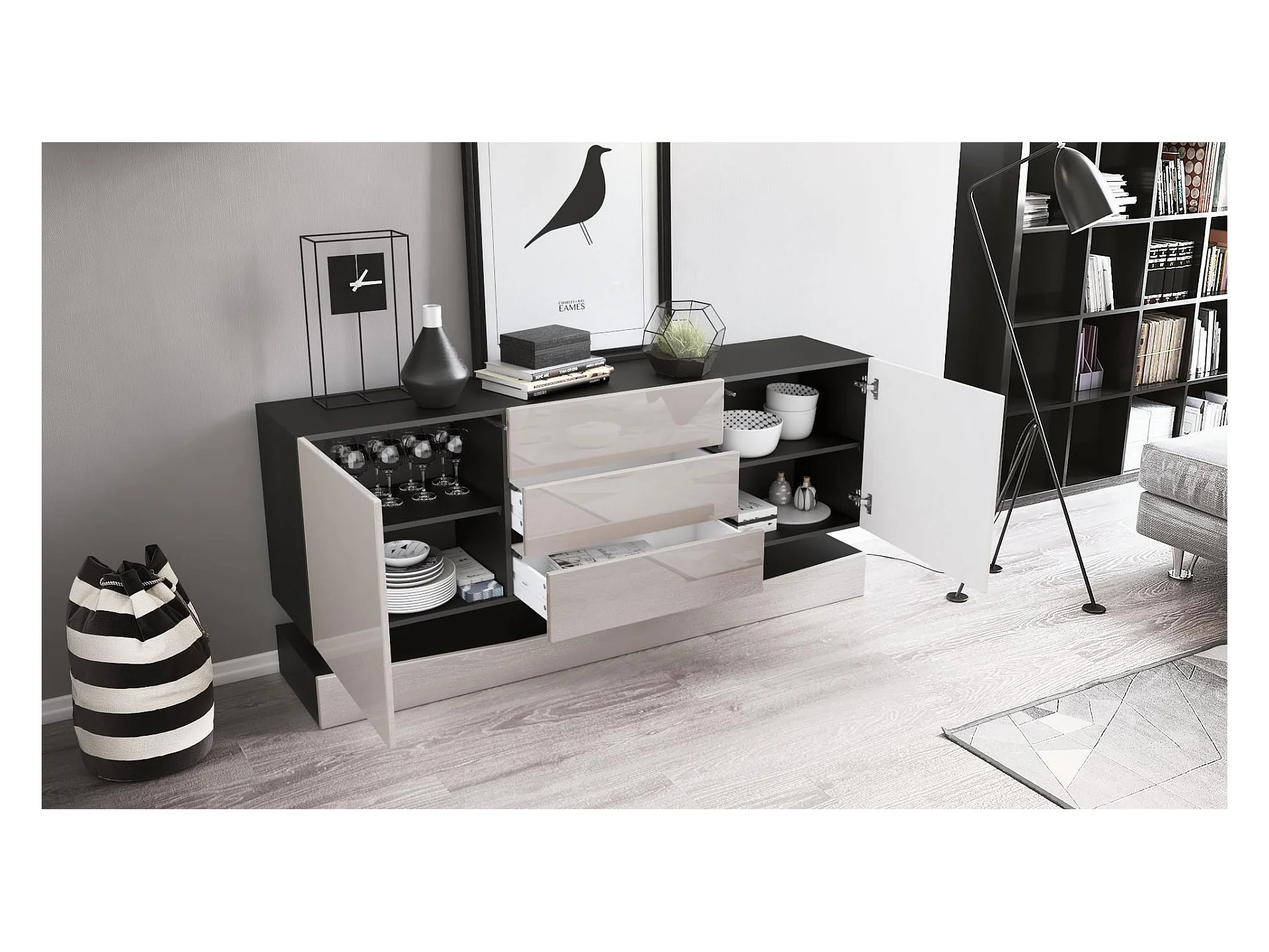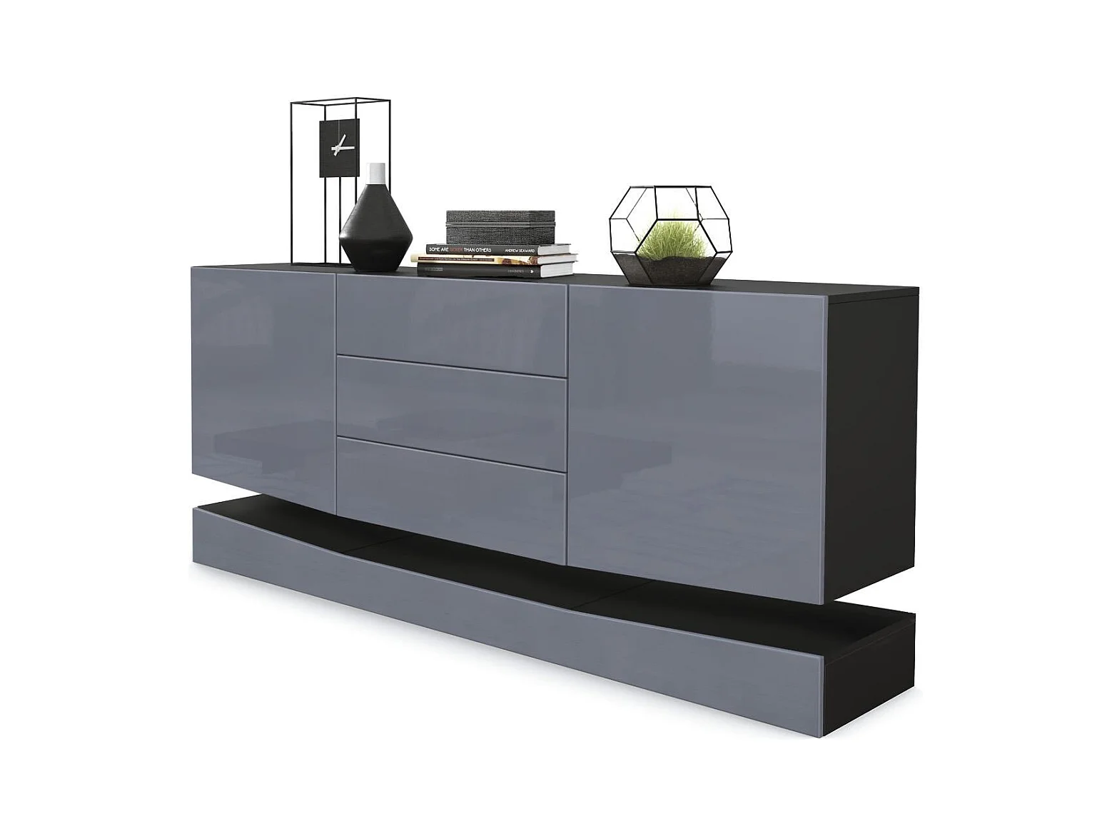 Sideboard City, noir mat/gris haute brillance - Commode moderne pour votre salon (178 x 72 x 38 cm)