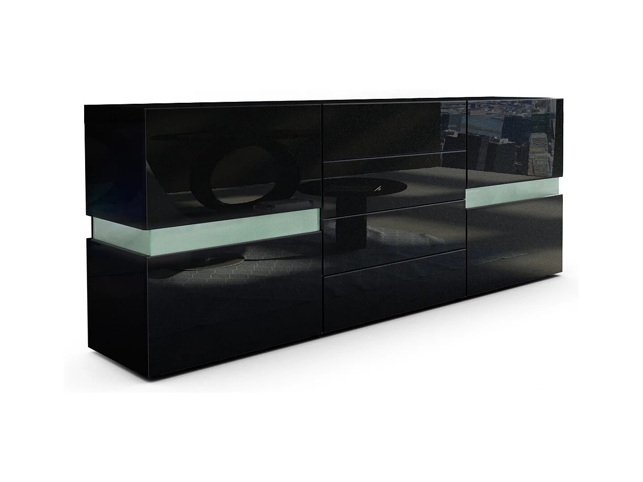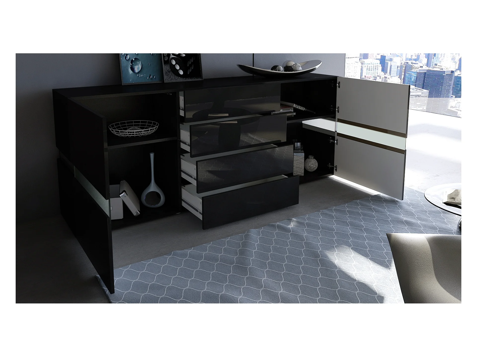 Sideboard Flow, noir mat/noir haute brillance - Commode moderne avec vitrage Ambient Light pour votre espace de vie (177 x 75 x 39 cm)