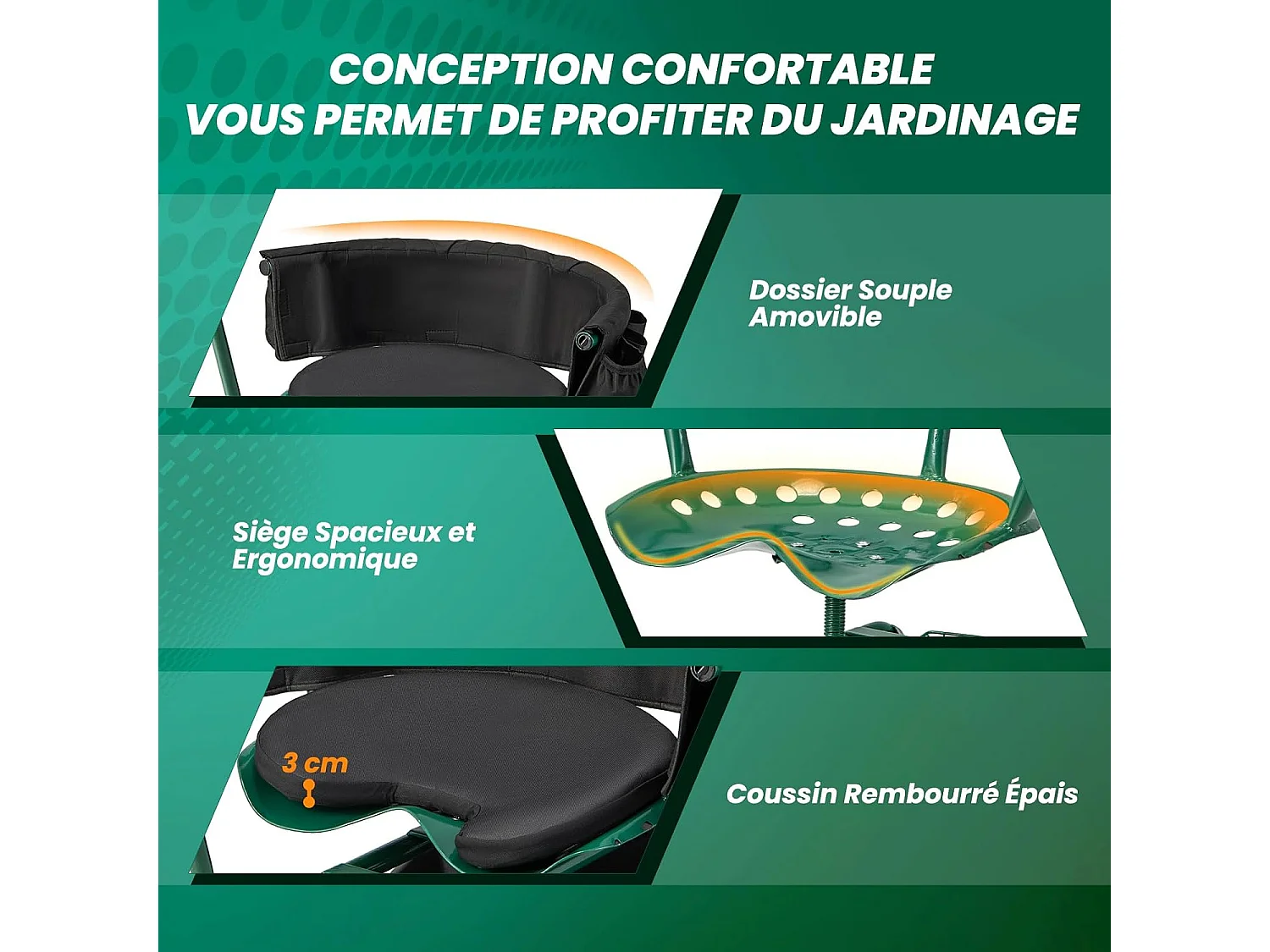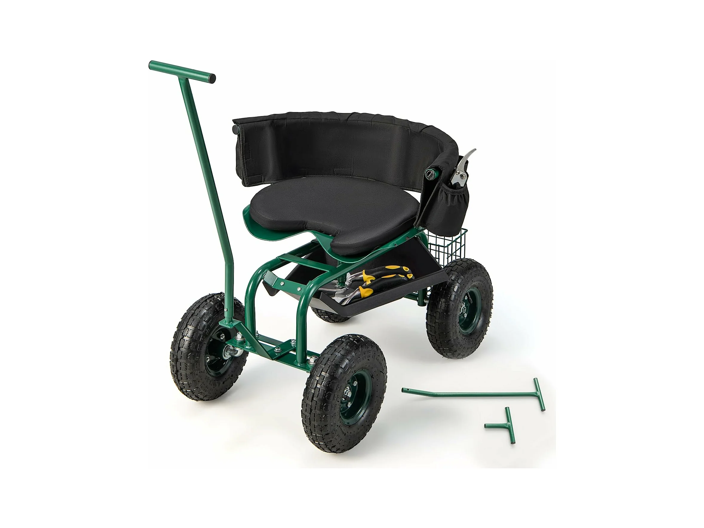 Siège de Jardin Roulant avec 2 Poignées de Direction, Chariot de Jardin avec Siège Pivotant à 360° Coussin Panier Plateau à Outils, 90 x 59 x 106 cm, Vert