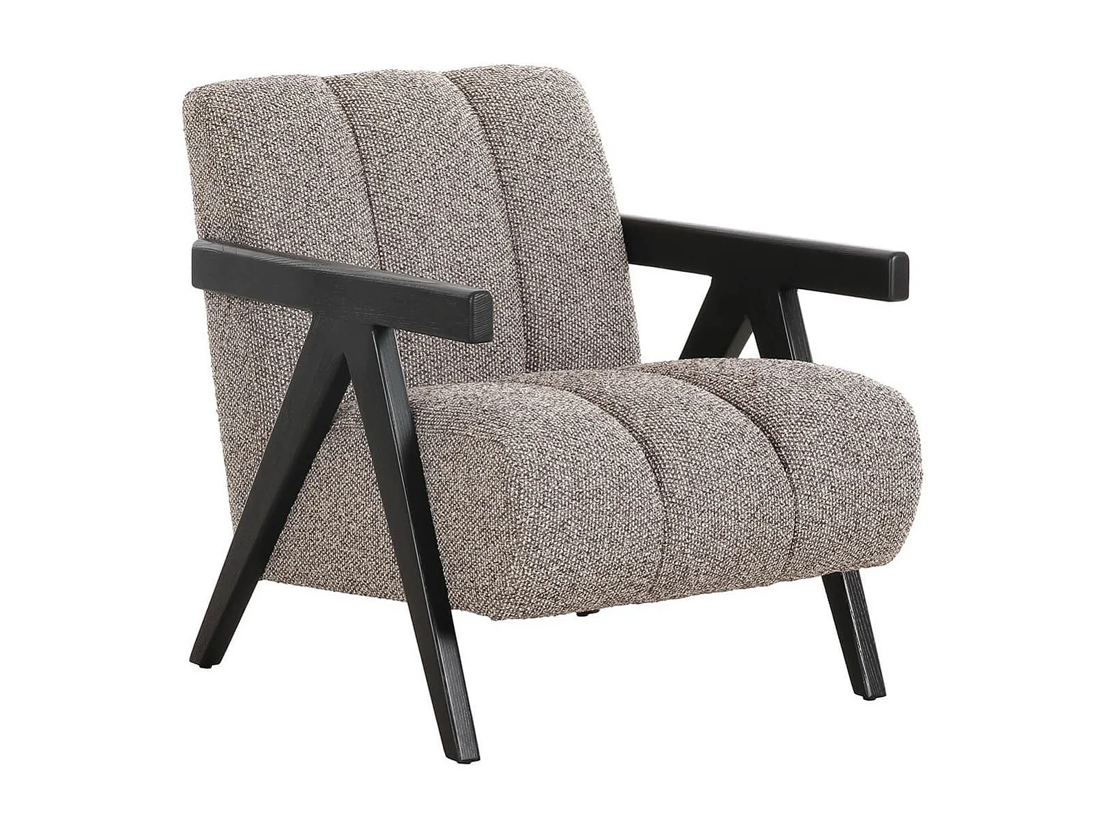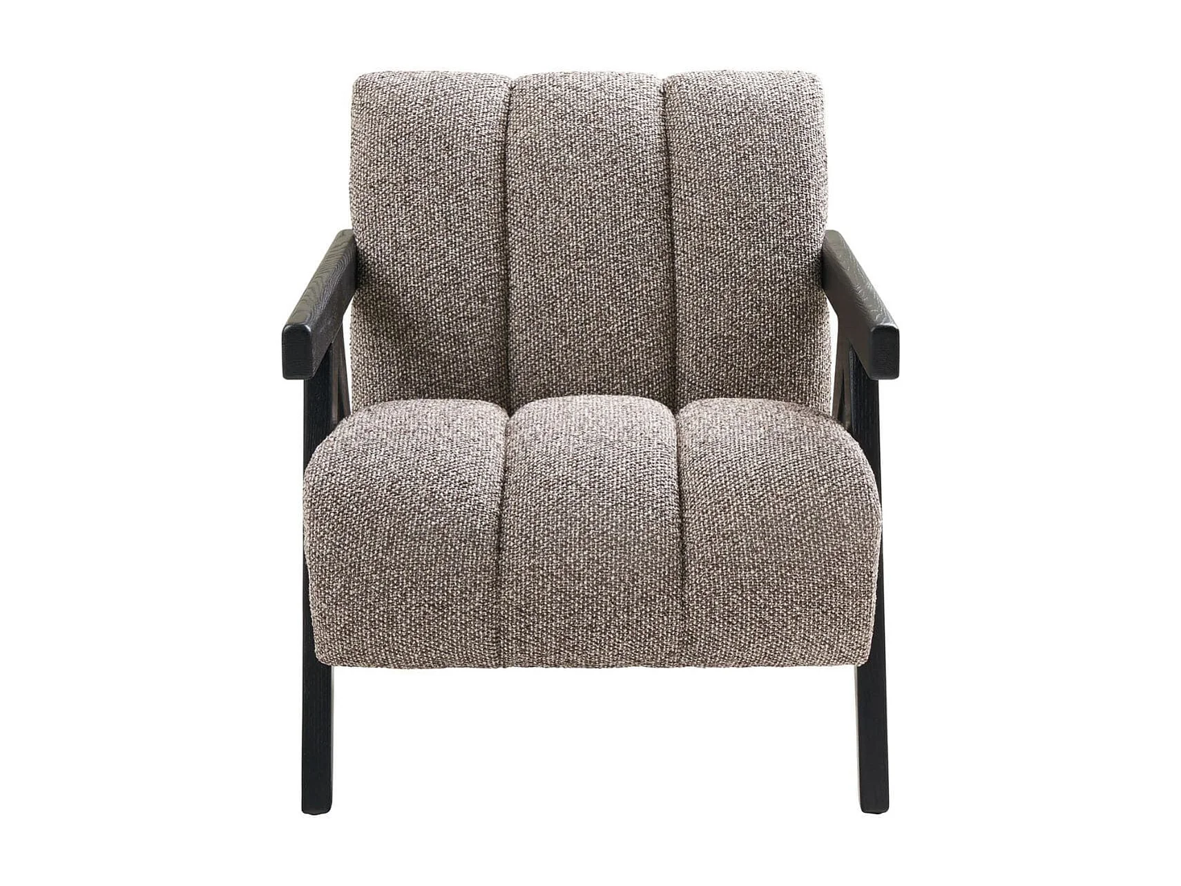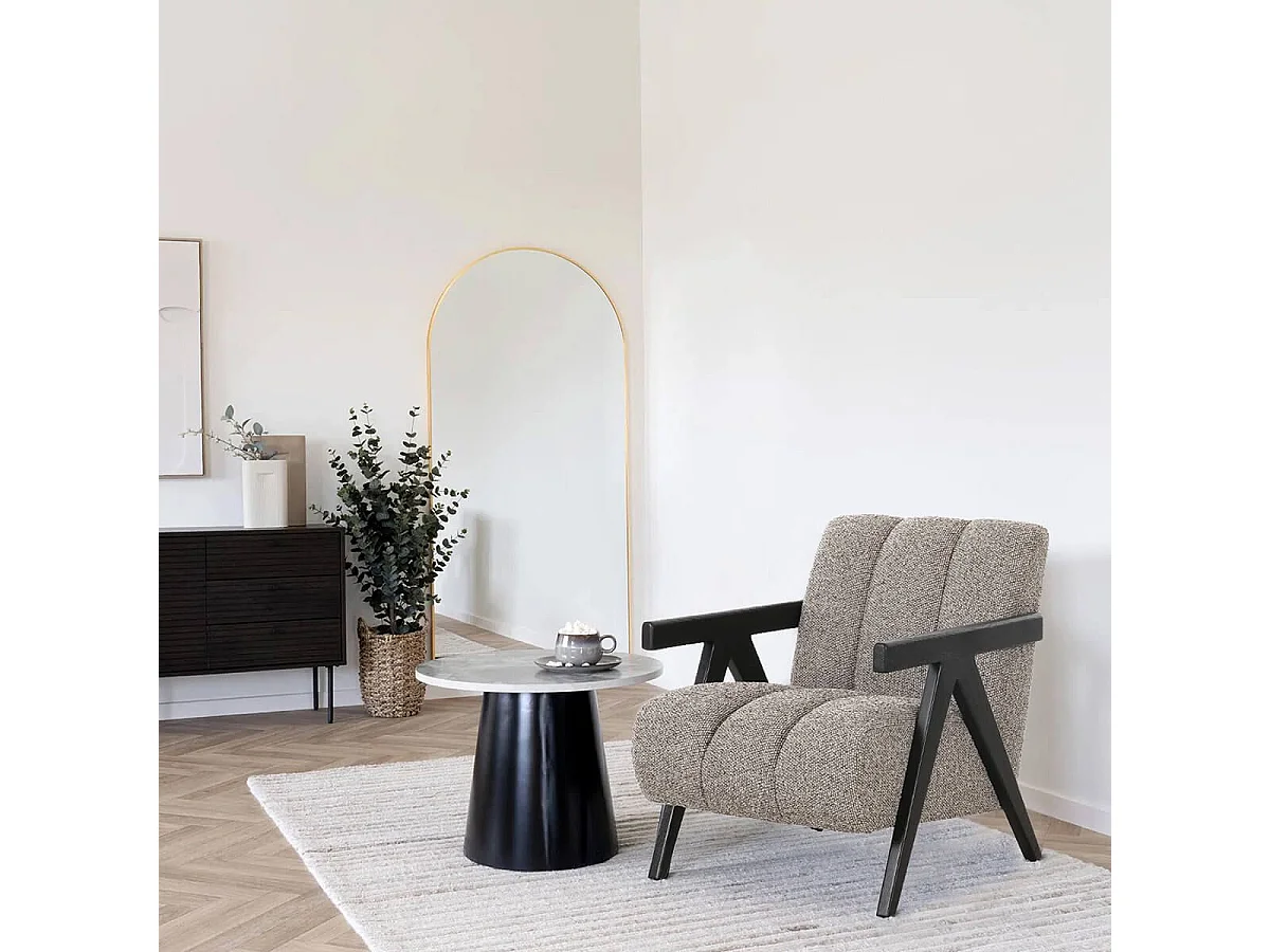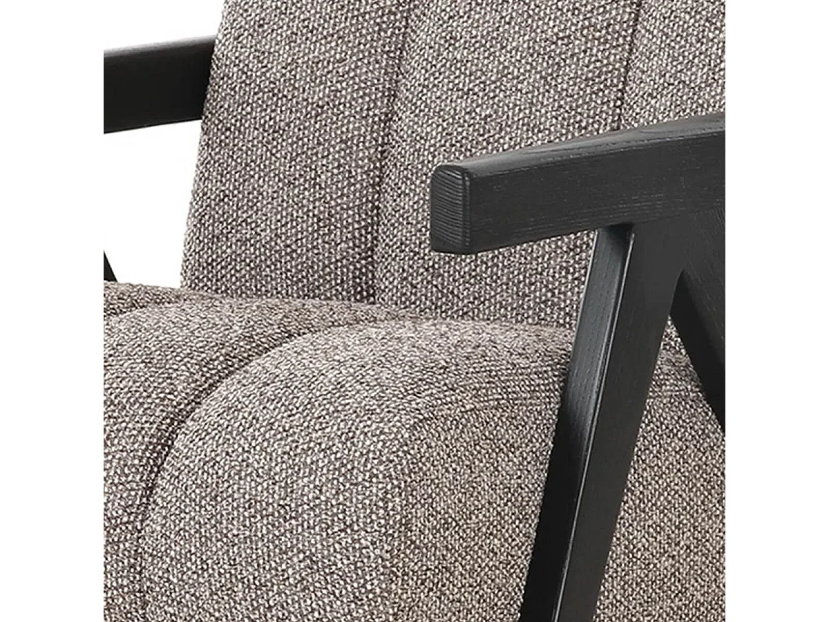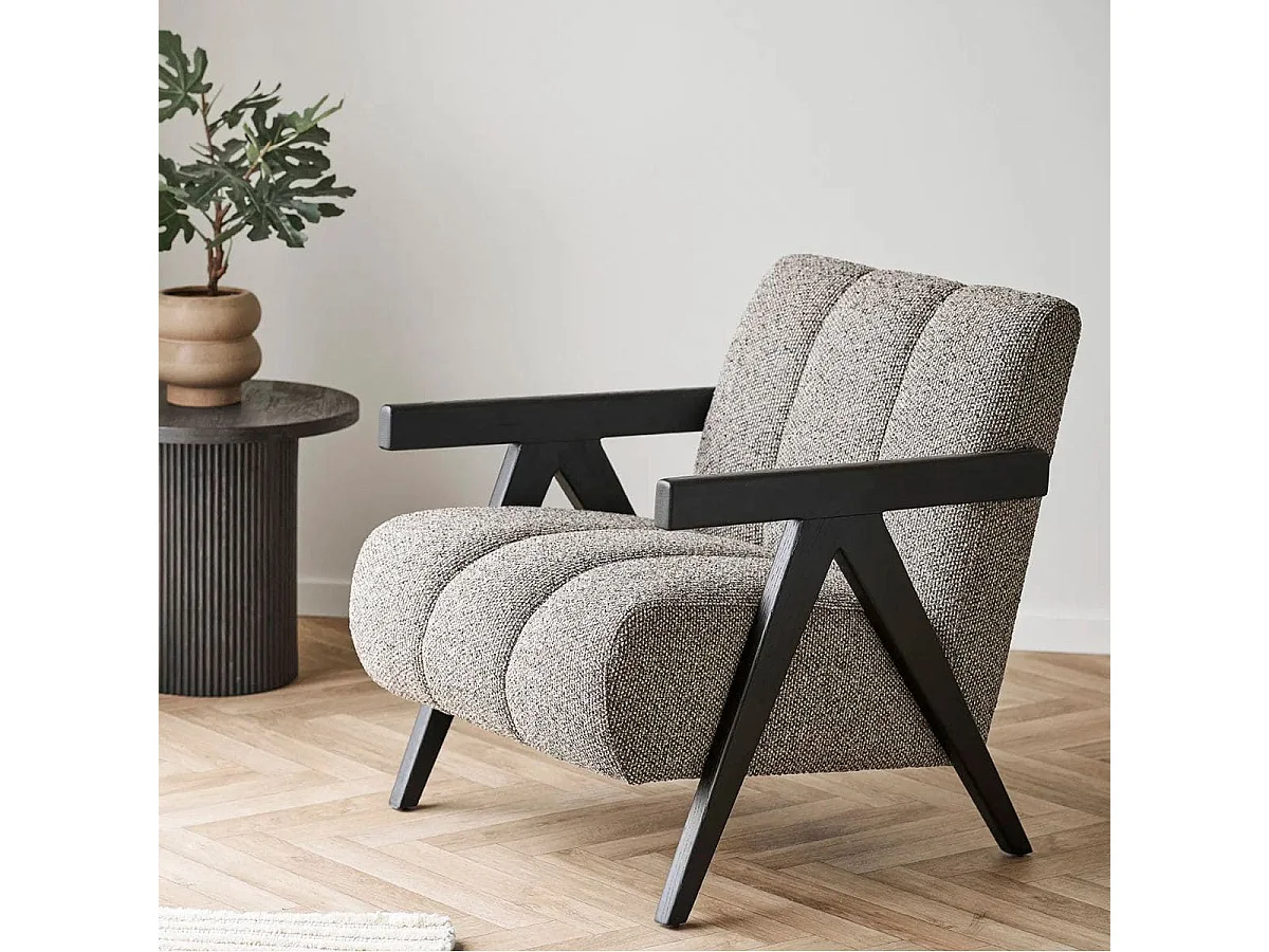SIGNOR - Fauteuil vintage tissu beige accoudoirs et pieds en bois teinté wengé