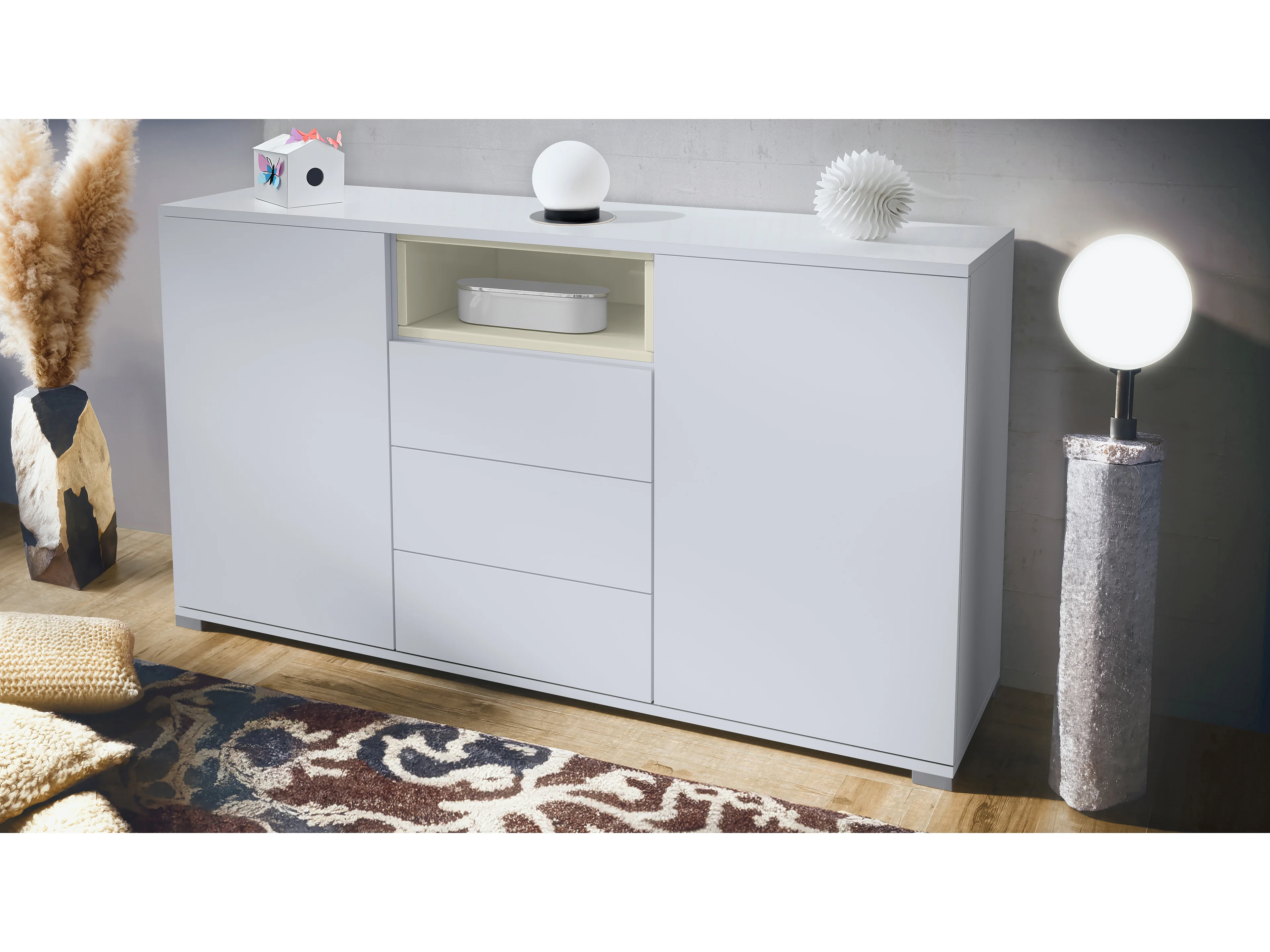 Skadu V2 Buffet, Commode avec 2 portes, 3 tiroirs et 1 compartiment ouvert, blanc mat/crème haute brillance (138,5 x 75,5 x 35 cm)