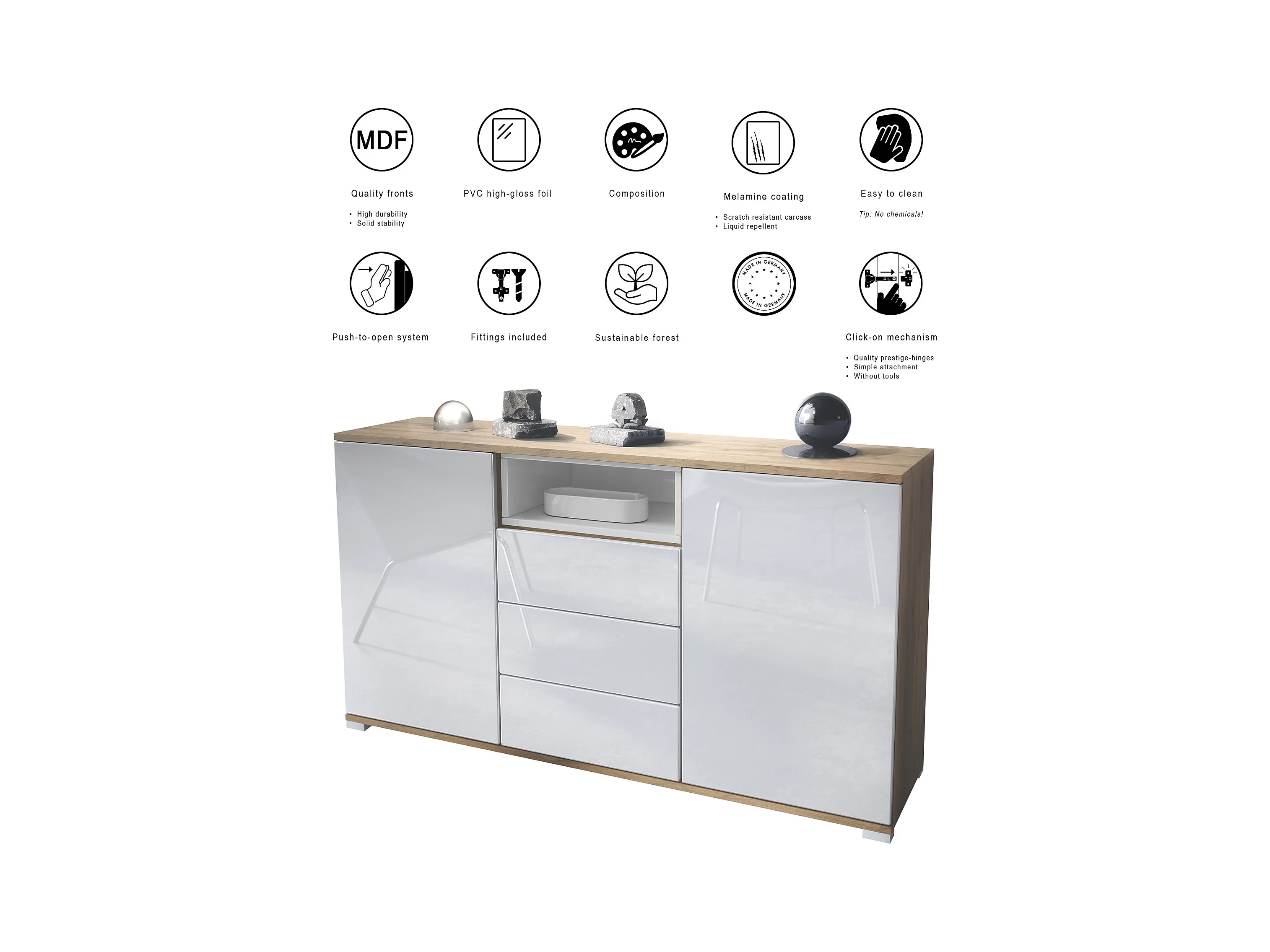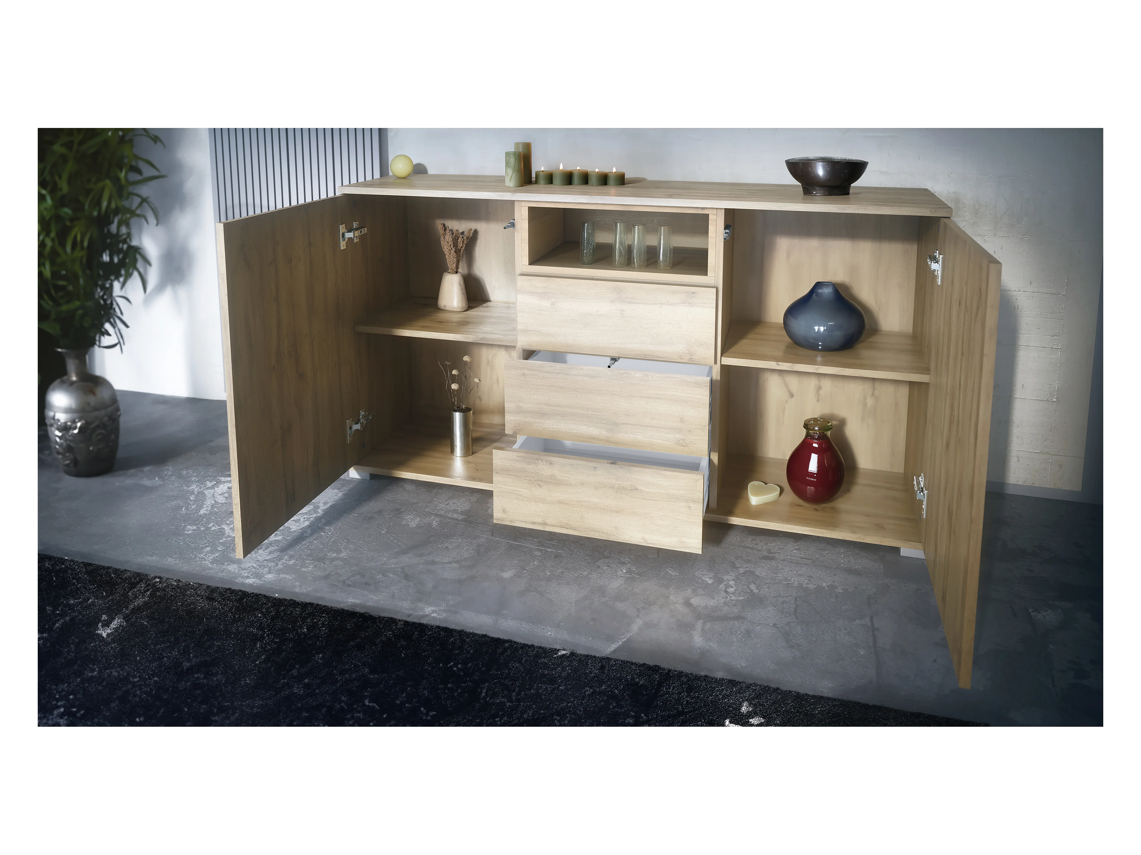 Skadu V2 Buffet, Commode avec 2 portes, 3 tiroirs et 1 compartiment ouvert, Chêne Evoke/denim mat (138,5 x 75,5 x 35 cm)