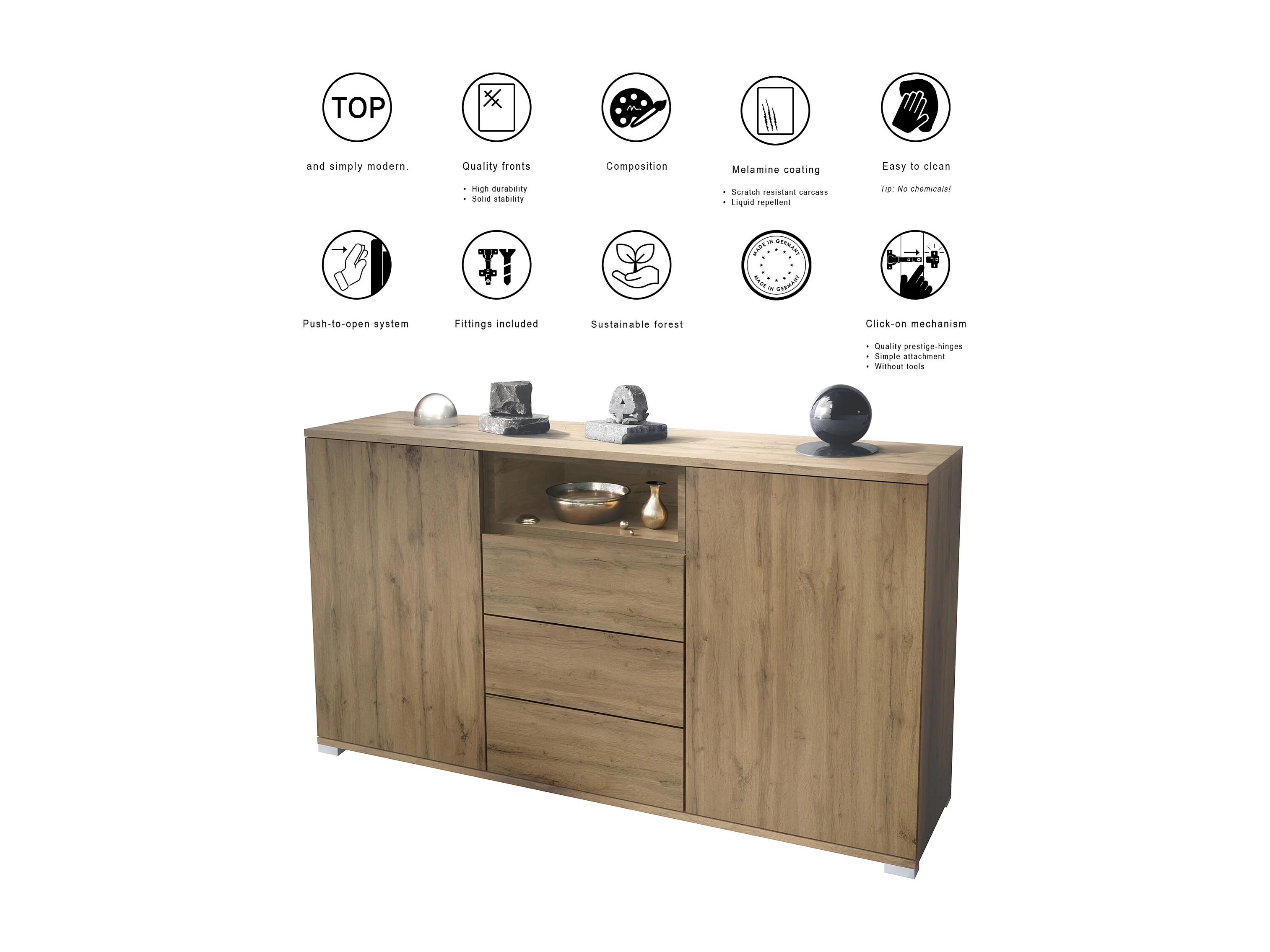 Skadu V2 Buffet, Commode avec 2 portes, 3 tiroirs et 1 compartiment ouvert, Chêne Evoke/noir mat (138,5 x 75,5 x 35 cm)