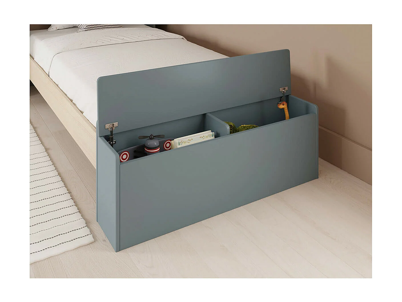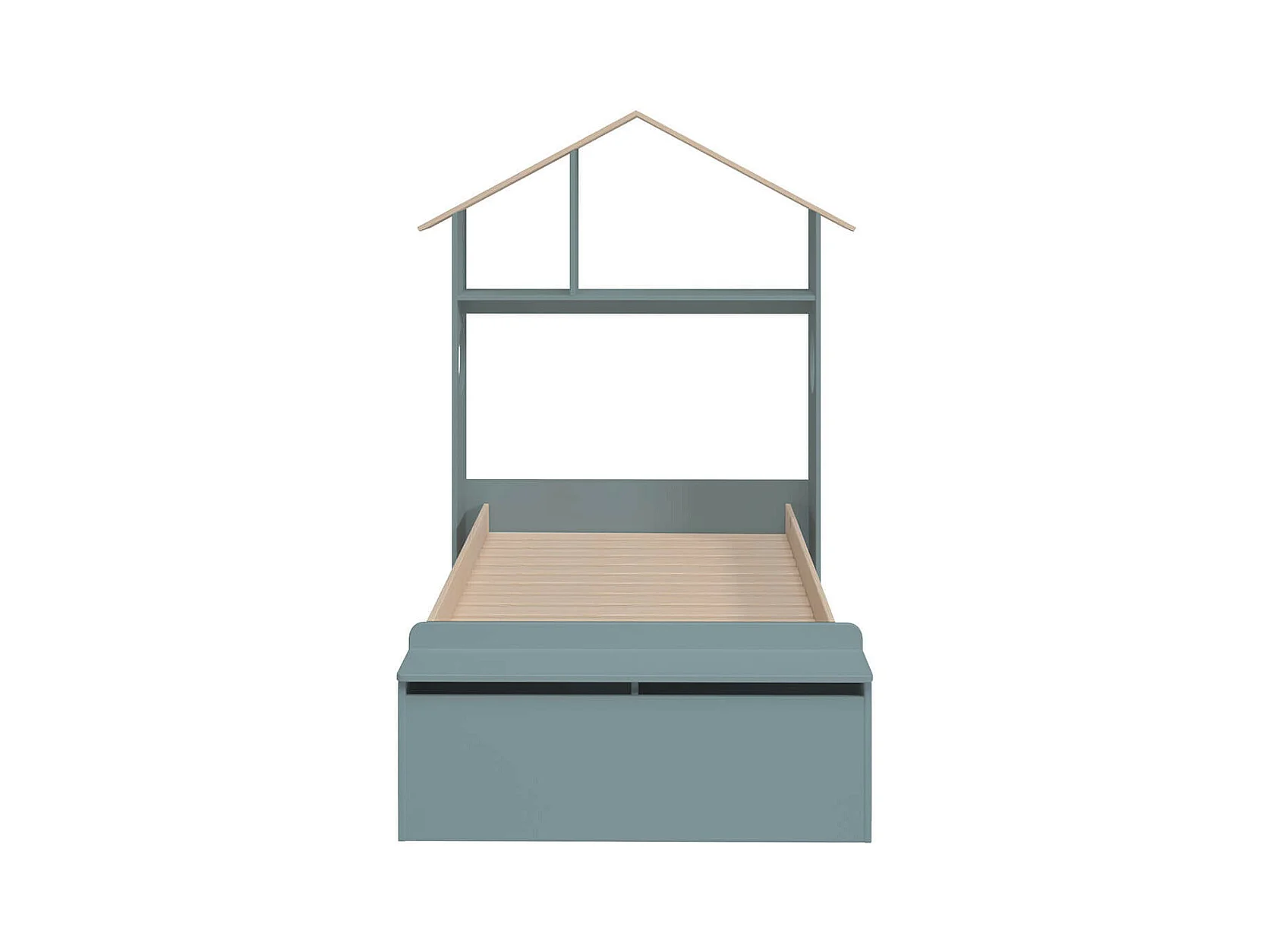 SKILA - Lit 90x190cm Tête de Lit Cabane et Banc-Coffre Gris Vert et Naturel