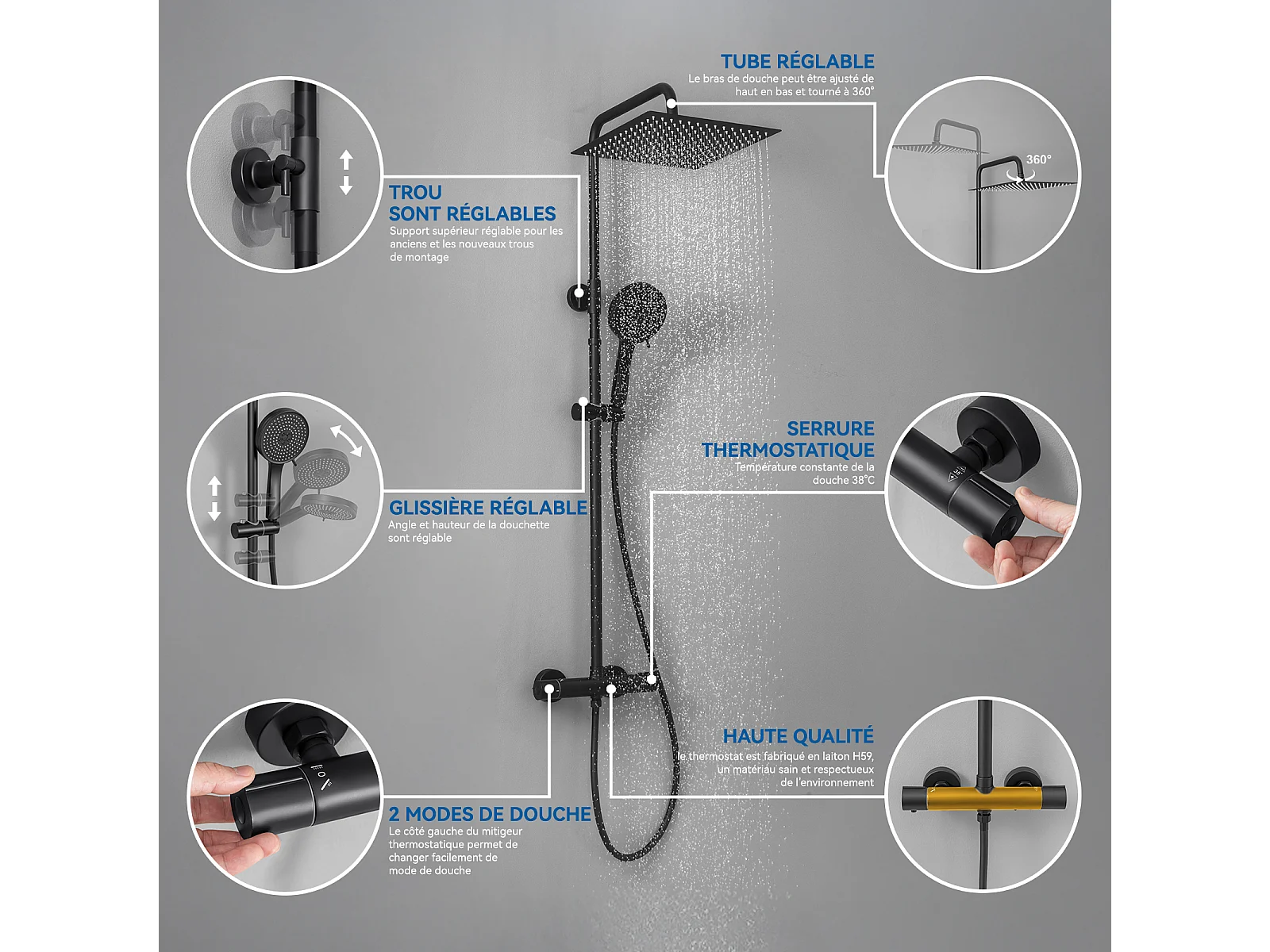 AICA colonne de douche thermostatique noir mat avec douche de tête carrée, douchette ronde à 3 jets, réglable en hauteur