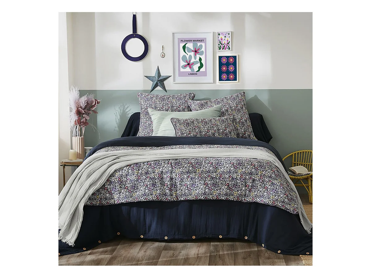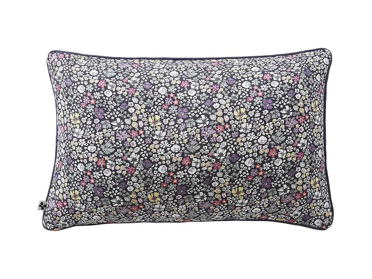 SOIZIC - Coussin Déhoussable 40x60cm Gaze de Coton Imprimé Bleu-Violet Imprimé Fleurs