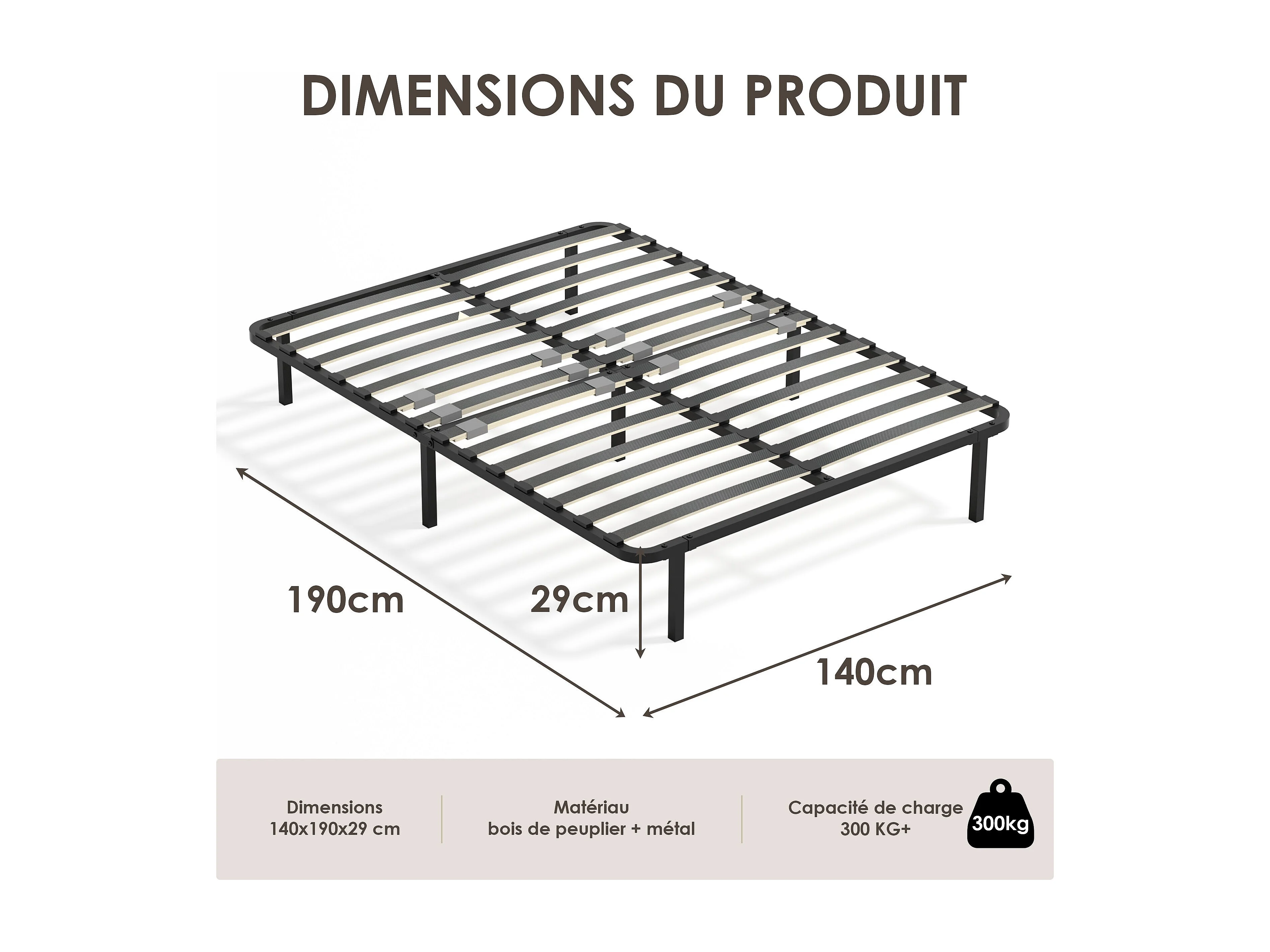Sommier à Lattes 140x190 , Lit 2×14Lattes, 9 Pieds