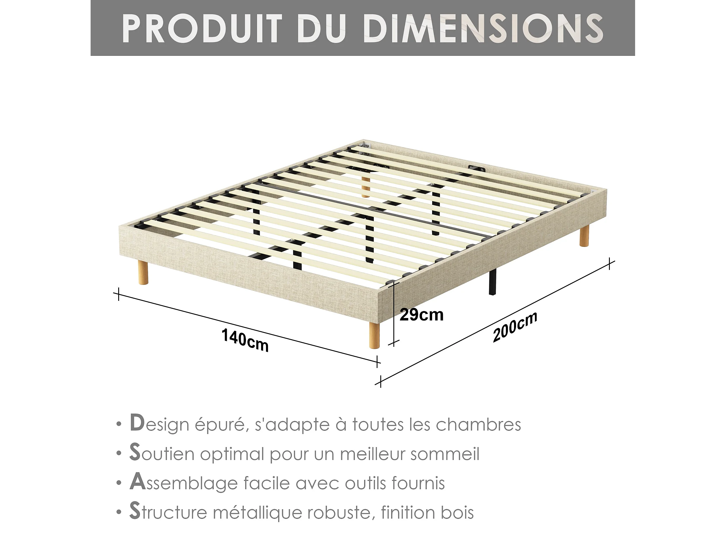 Sommier tapissier 140x200cm, 14 lattes, 9 pieds Hauteur du cadre 29 cm