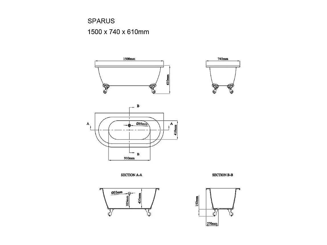 Baignoire semi-îlot retro avec pieds d'aigle - 154 L - 150 x 74 x 61 cm - Vert mat - Acrylique - SPARUS