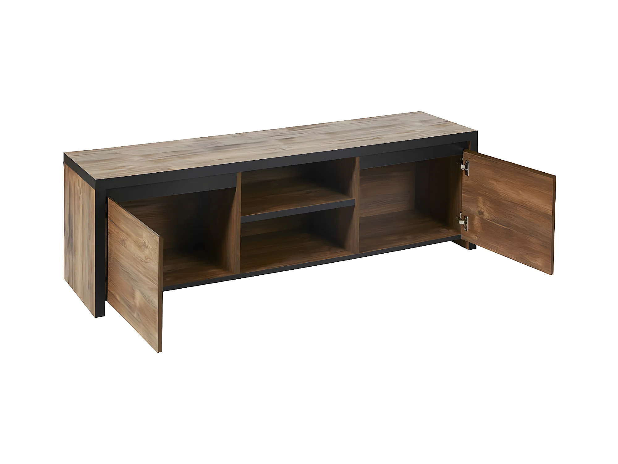 STALONE - Meuble TV 2 Portes 2 Niches Effet Bois Manguier Foncé et Noir