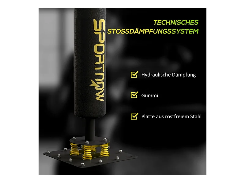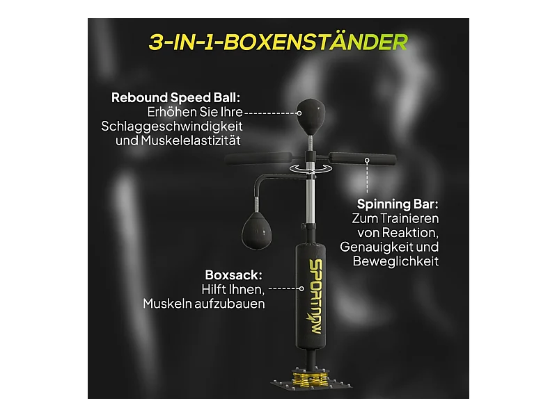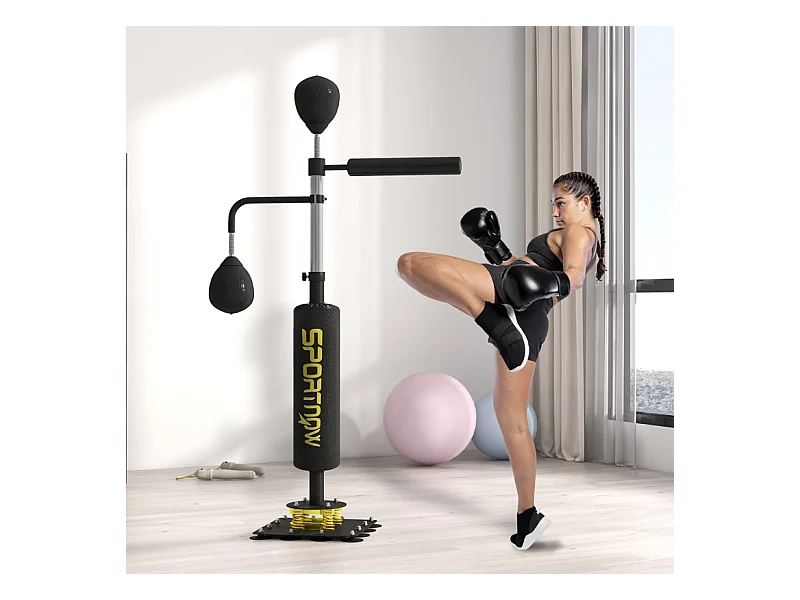 Stand de boxe avec 2 balles de vitesse, barre rotative et coussin de frappe, réglable en hauteur, acier, noir (107x36x140-205cm)