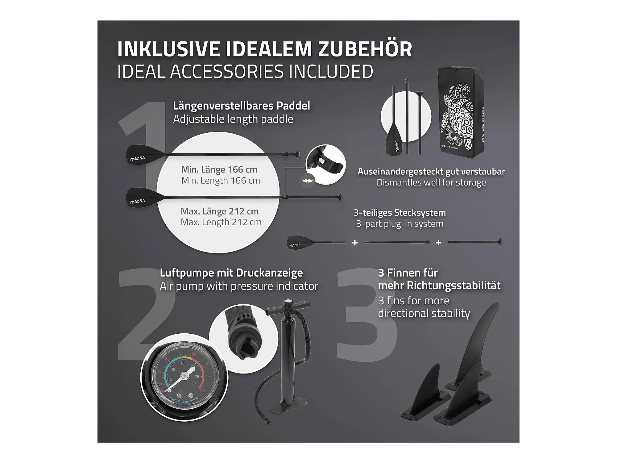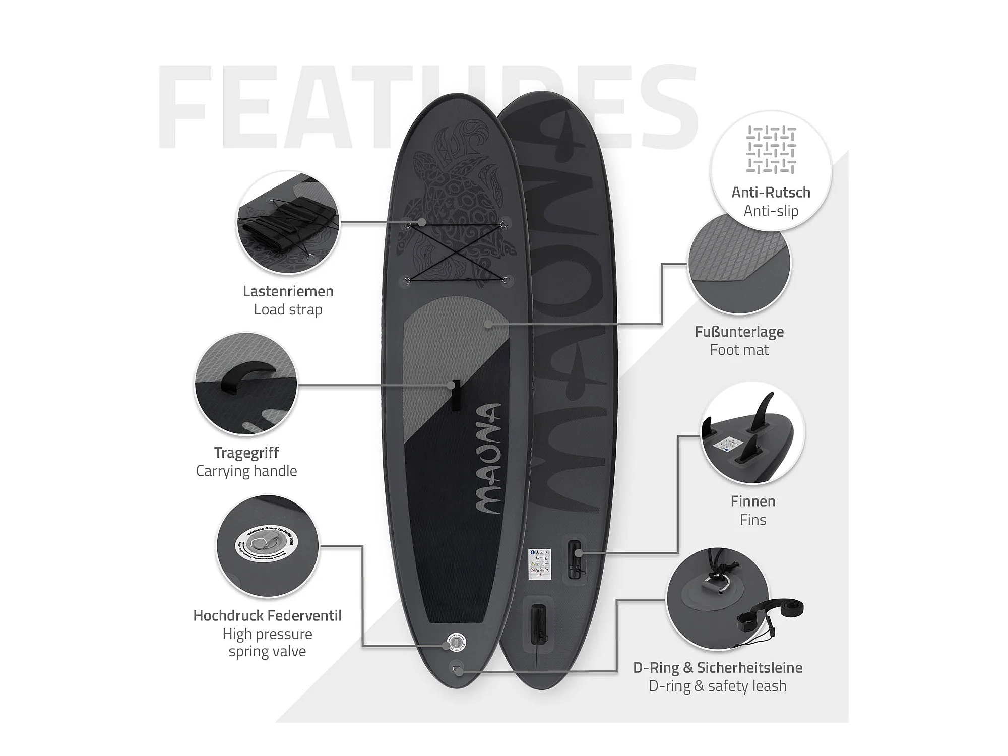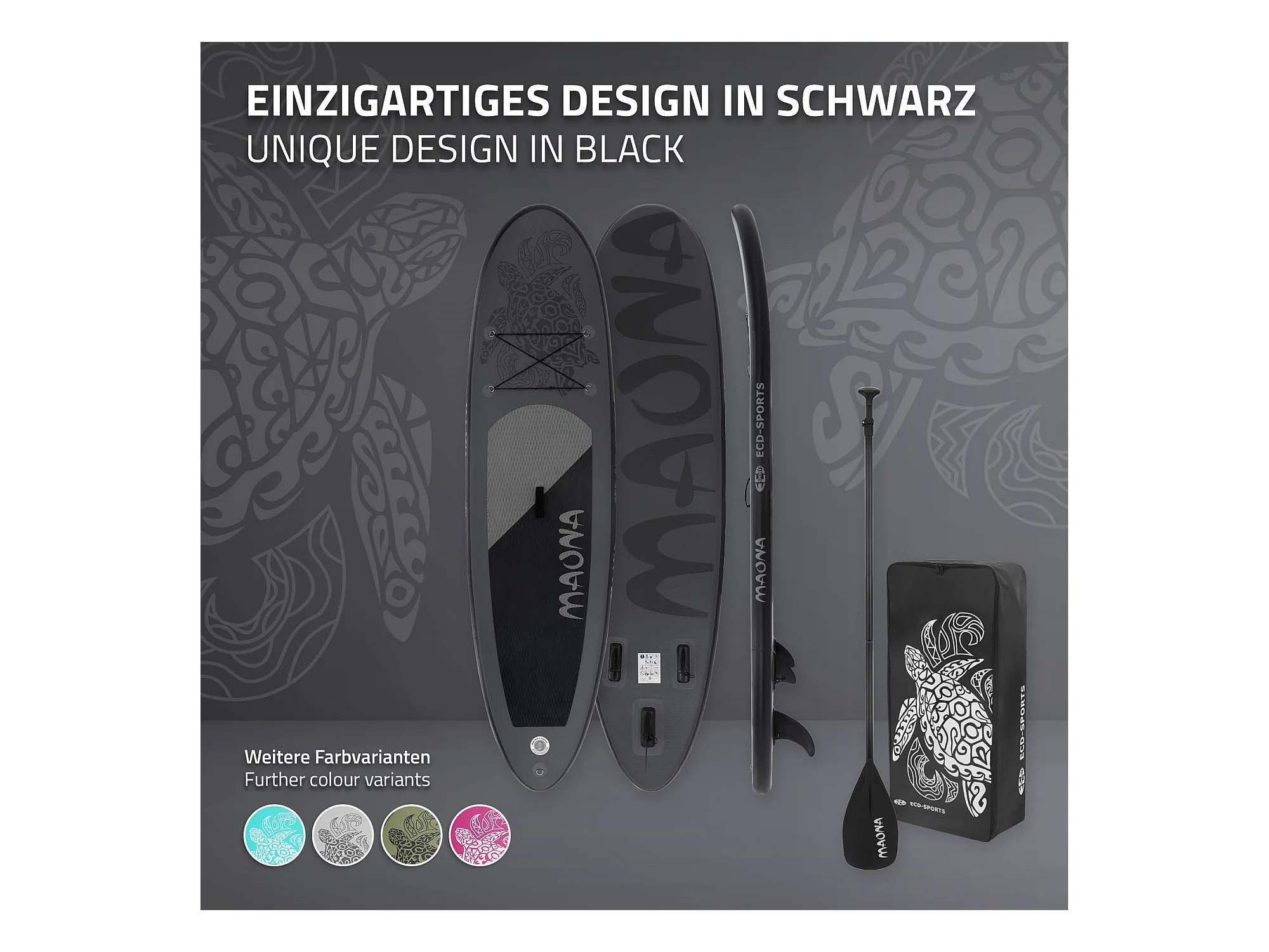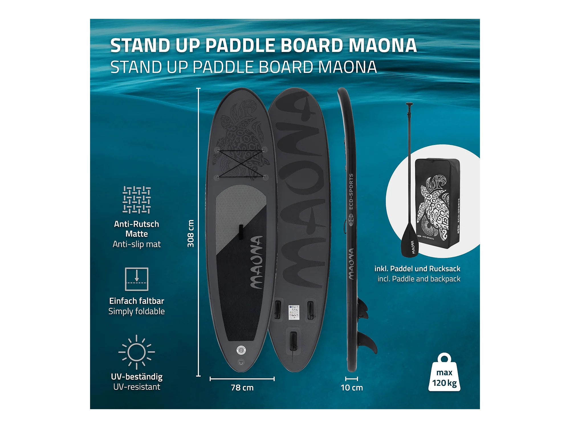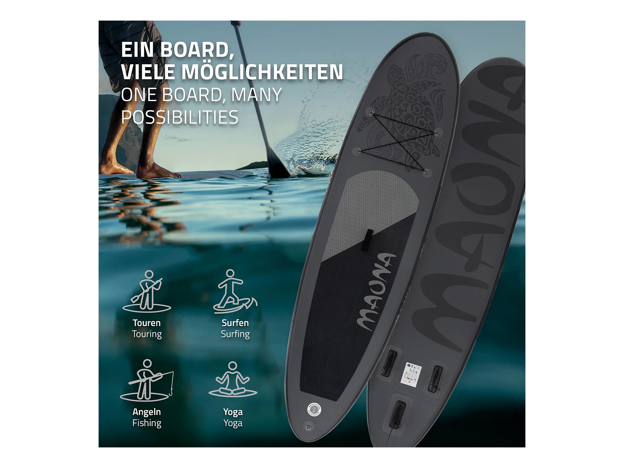 Planche stand up Maona 308 x 78 x 10 cm noir PVC gonflable jusqu'à 120 kg revêtement antidérapant avec pompe sac de transport kit de réparation pagaie