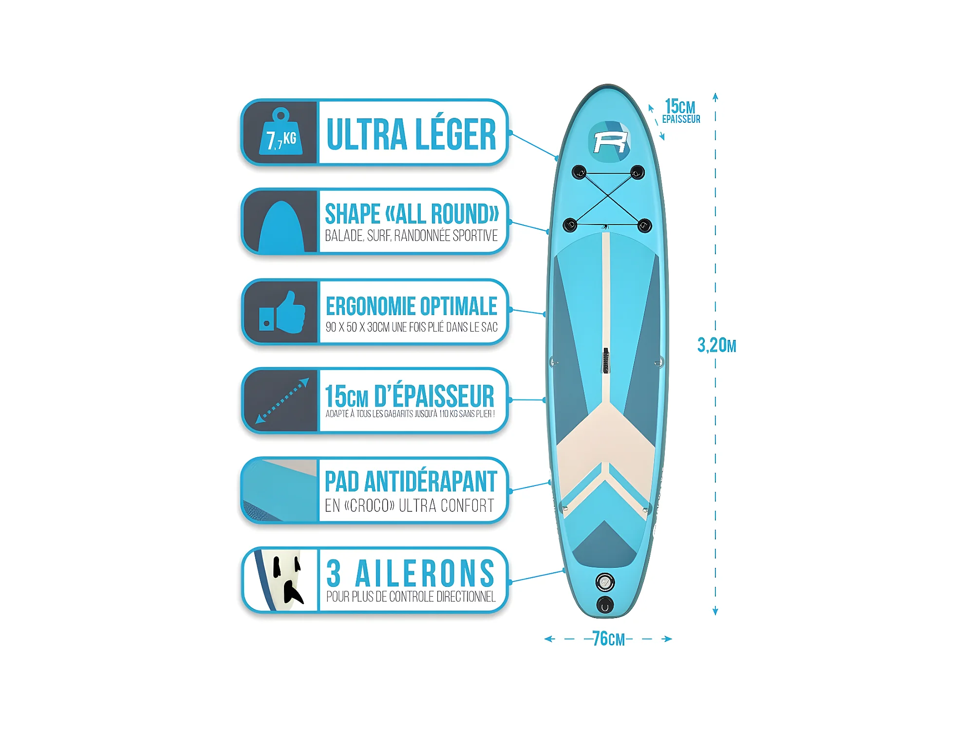 Stand Up Paddle gonflable INDIANA BLUE ROHE 10'6'' (320cm) 30'' (76cm) 6'' (15cm) avec Pompe, Pagaie, Leash et Sac de transport