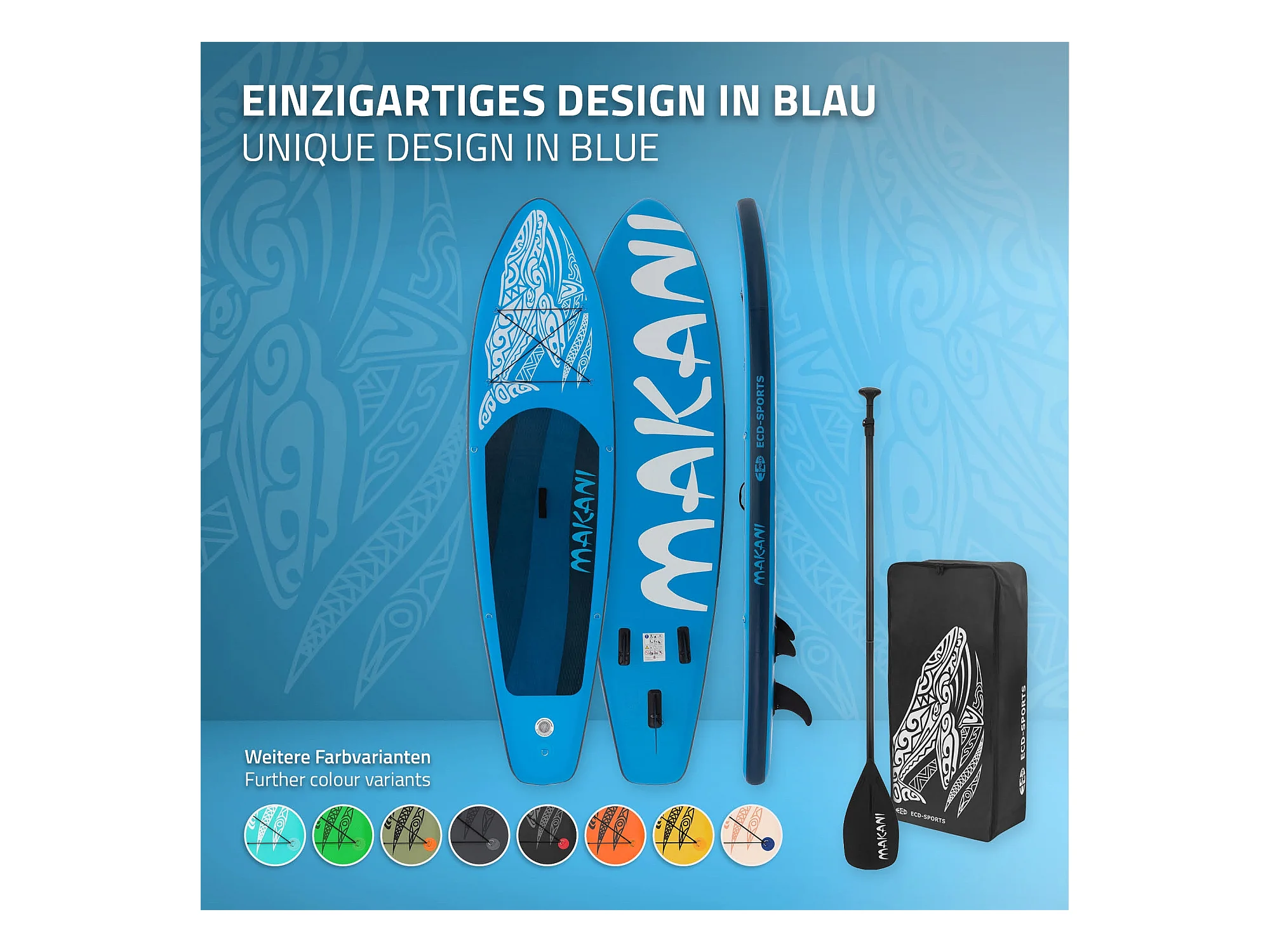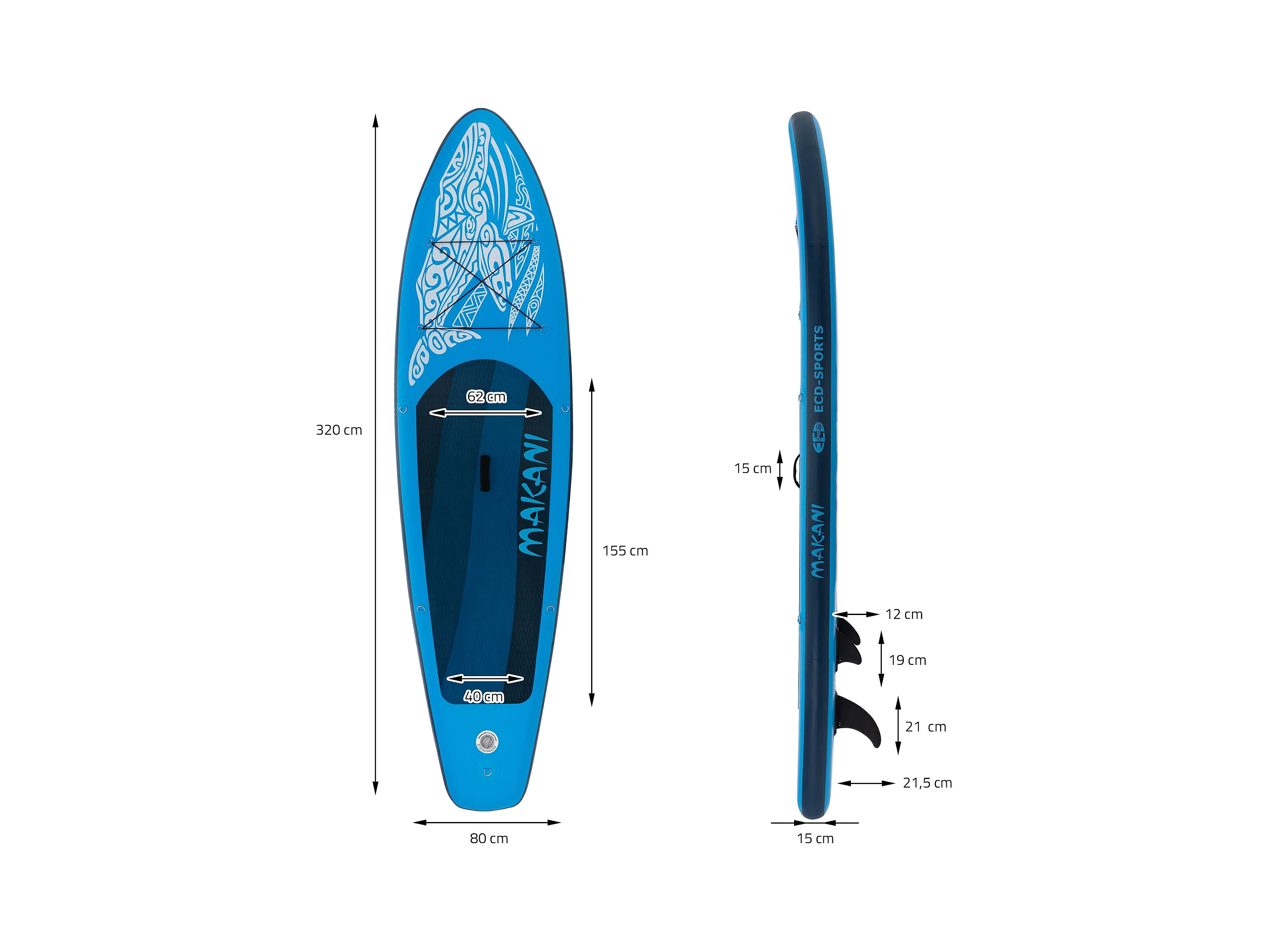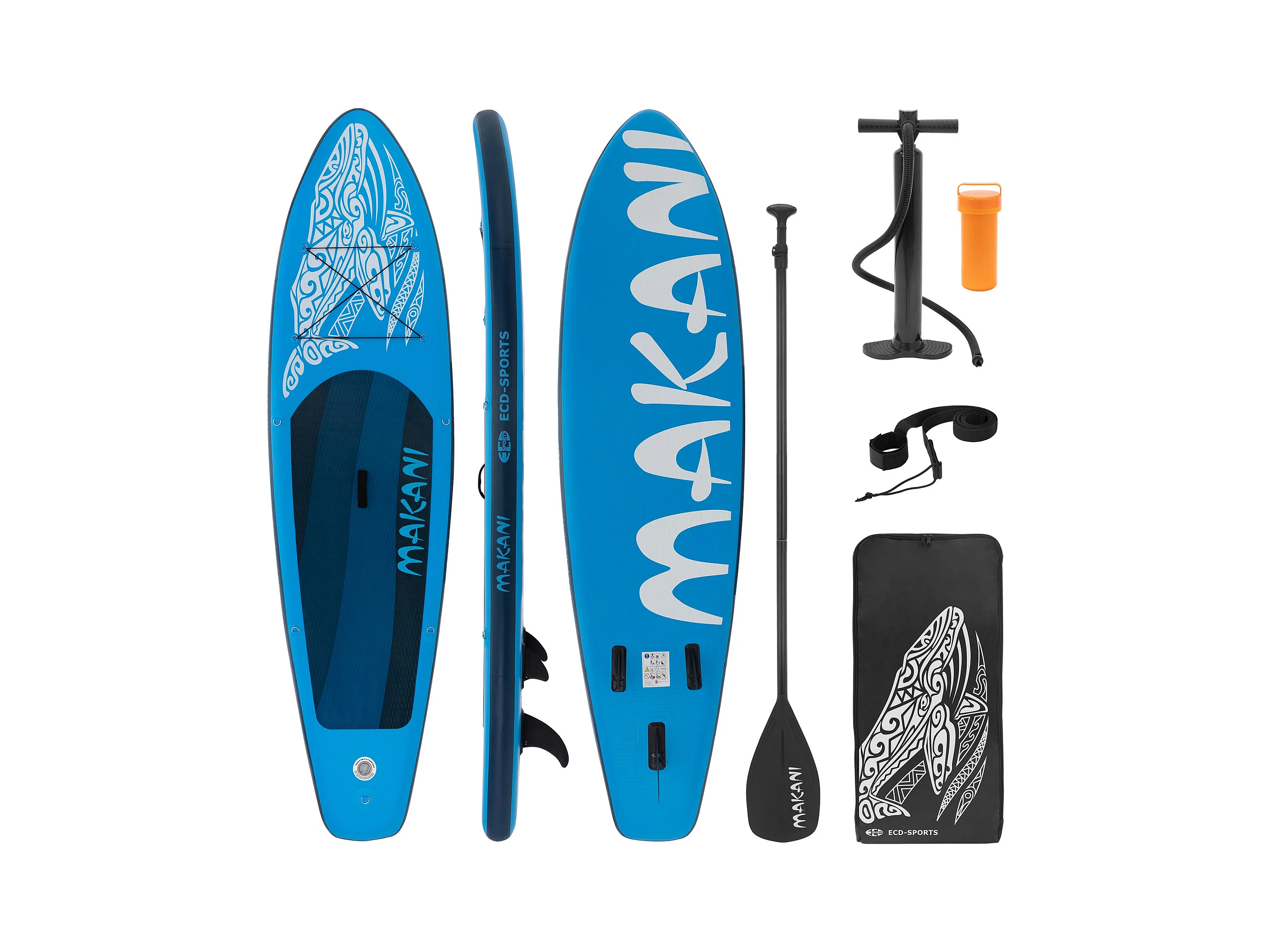 Planche stand up Makani 320x80x15 cm bleu PVC gonflable jusqu'à 120 kg revêtement antidérapant avec pompe sac de transport kit de réparation pagaie