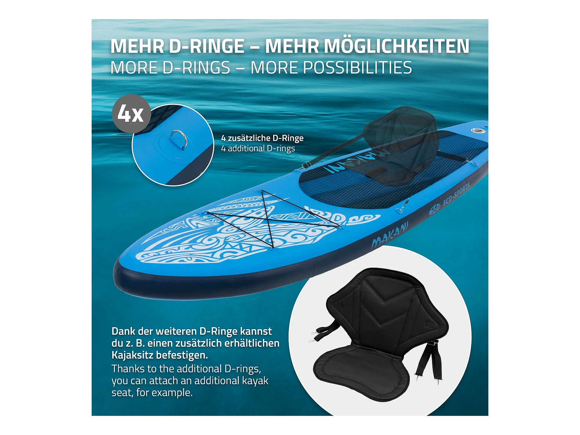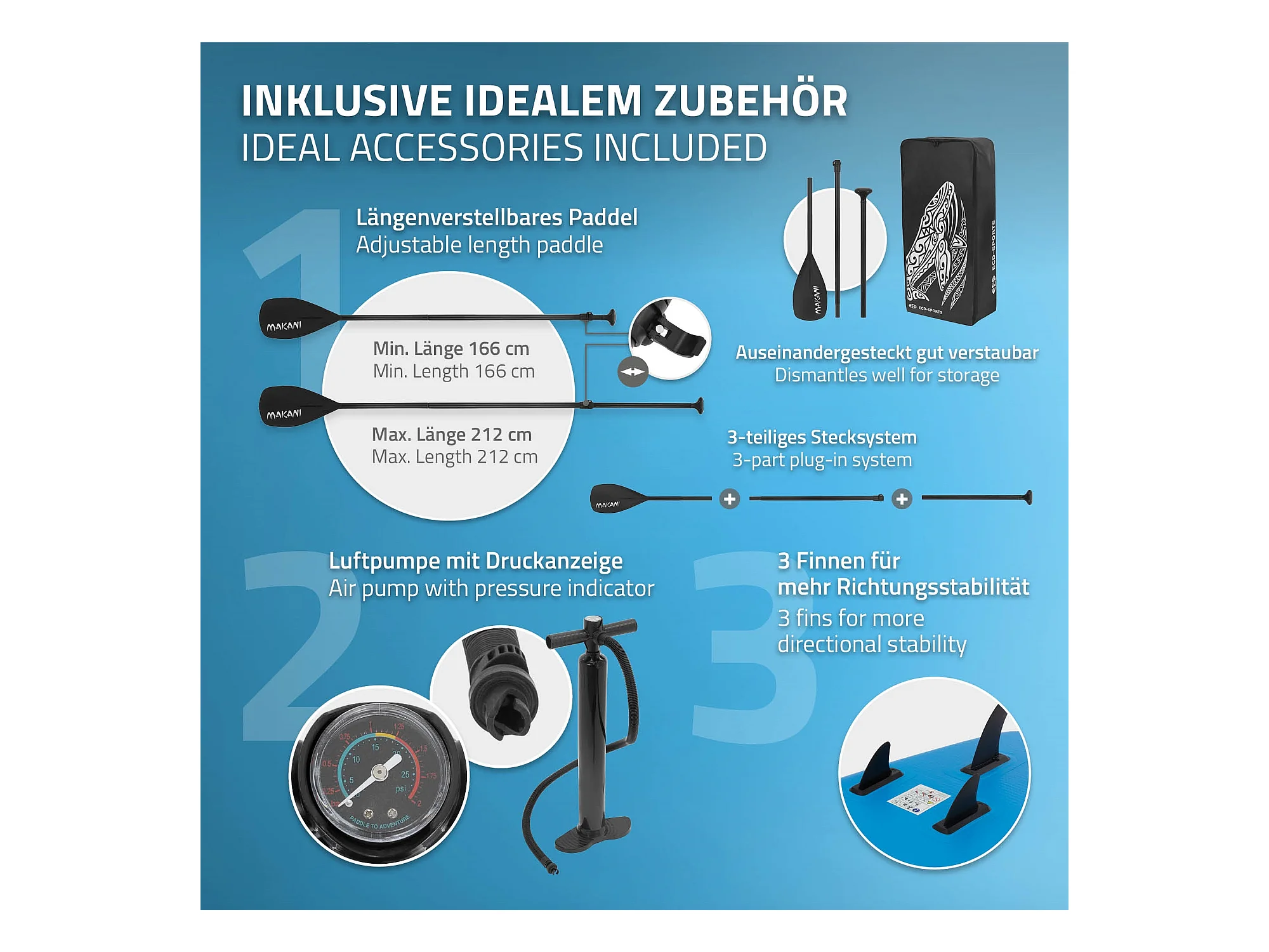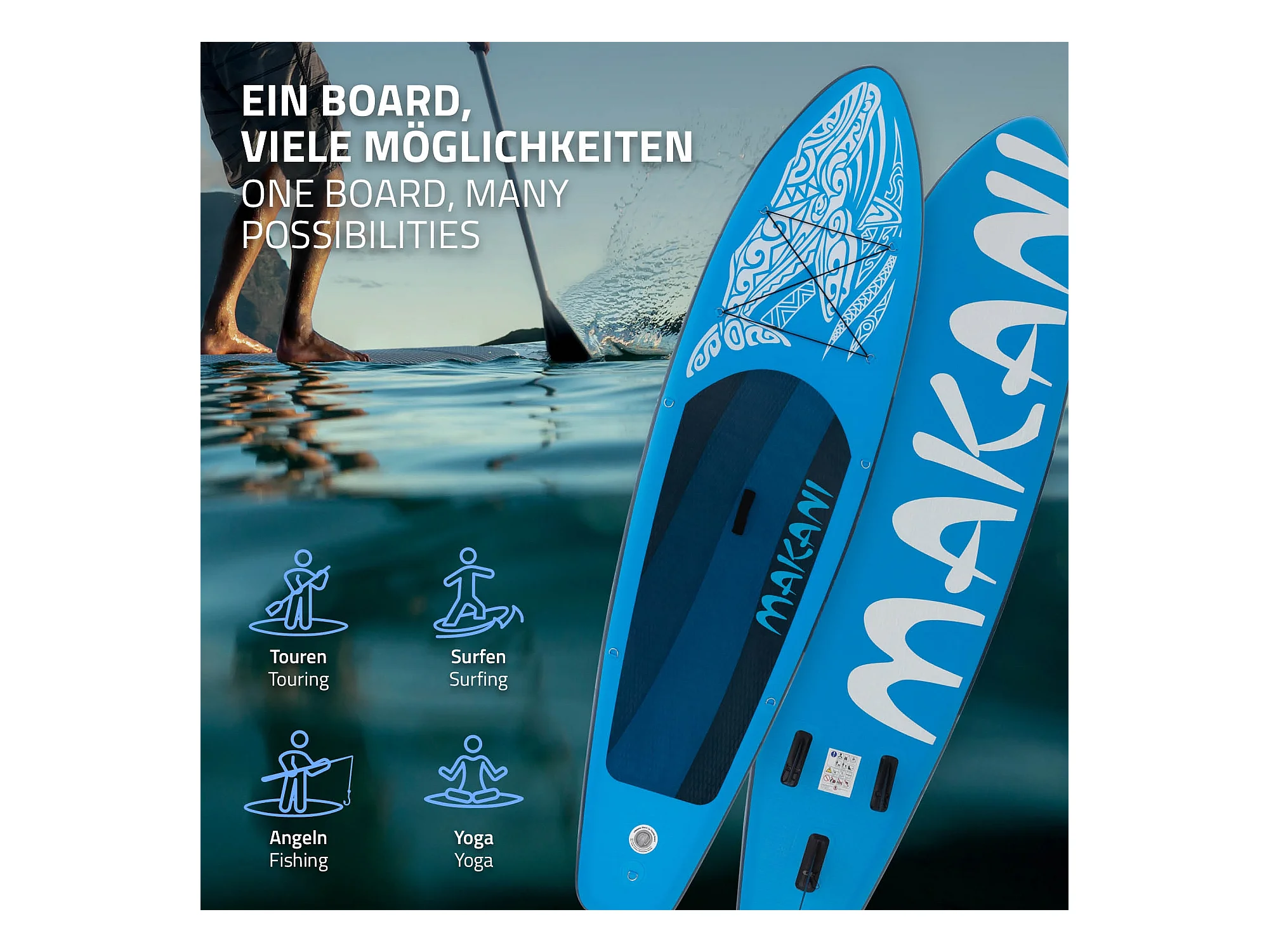 Planche stand up Makani 320x80x15 cm bleu PVC gonflable jusqu'à 120 kg revêtement antidérapant avec pompe sac de transport kit de réparation pagaie