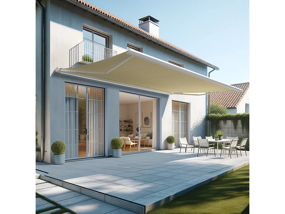 Store banne coffre HEVOA 6,00x3,50 m Motorisé Secours à Télécommande + LED - Blanc - Écru
