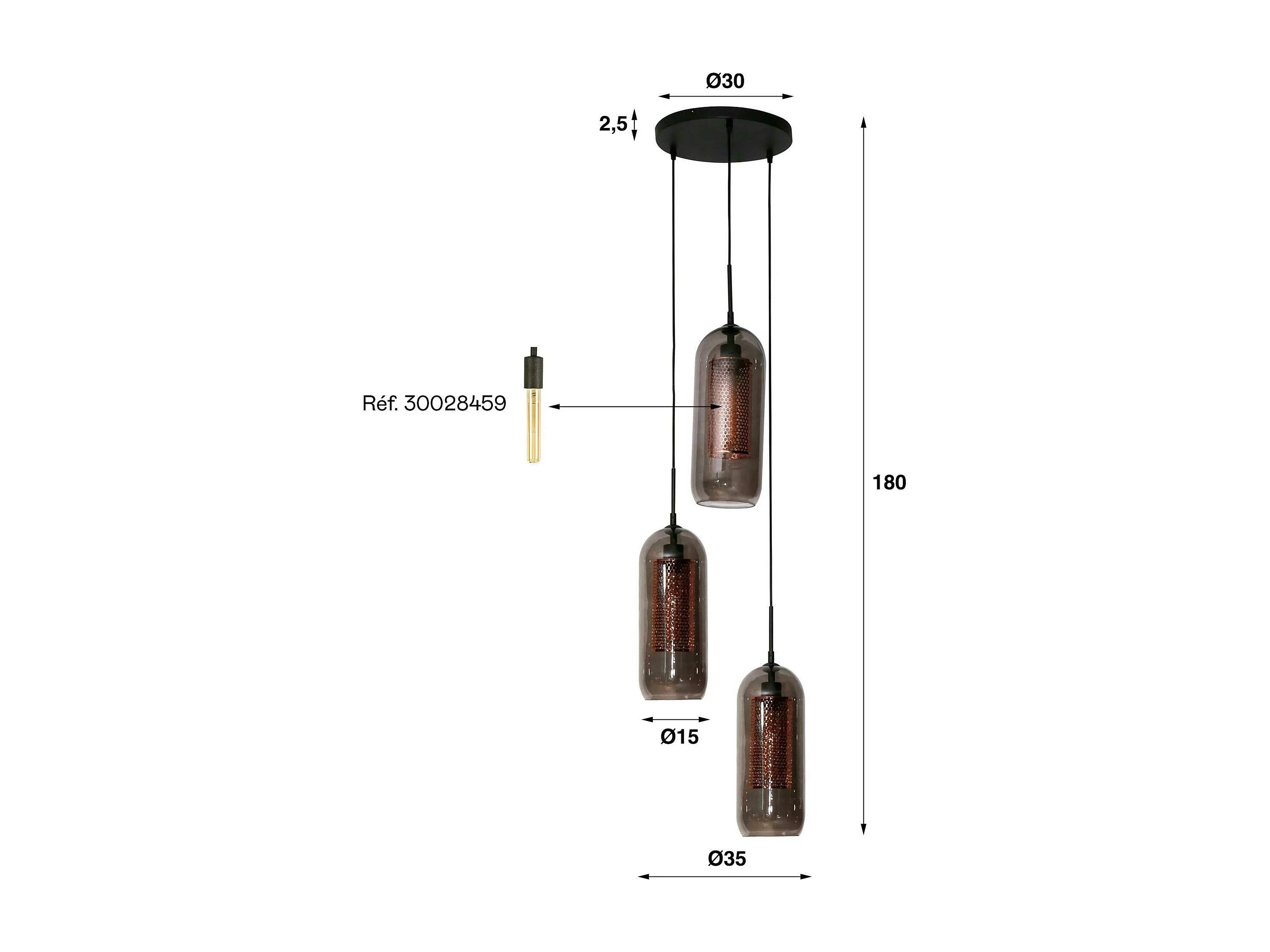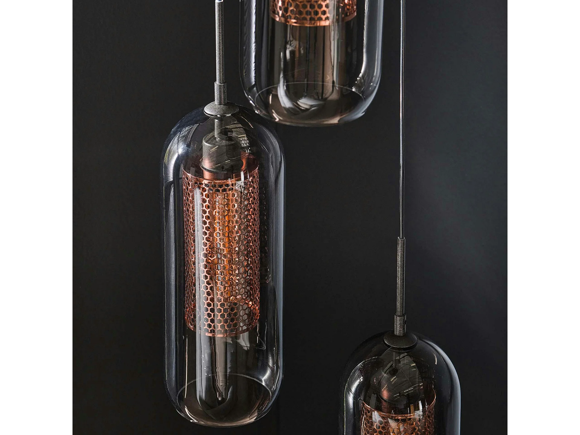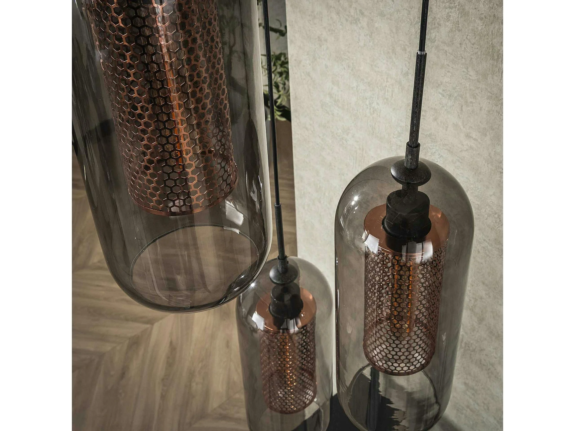 Suspension en verre fumé et métal cuivré 3 lampes NOVA