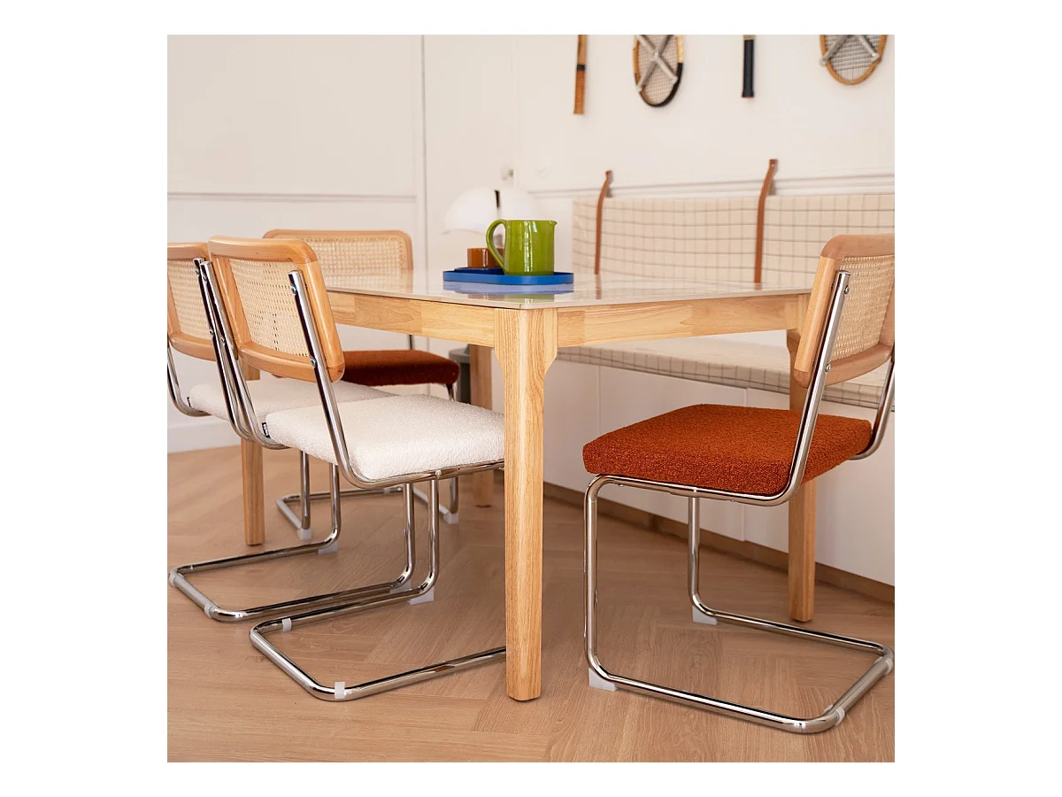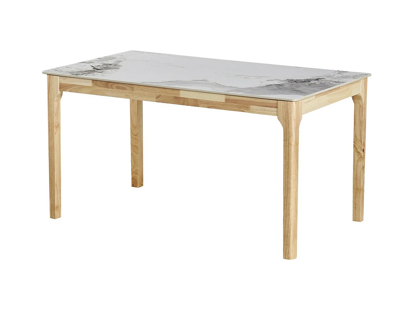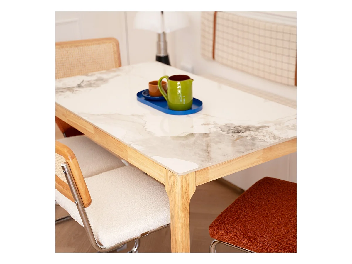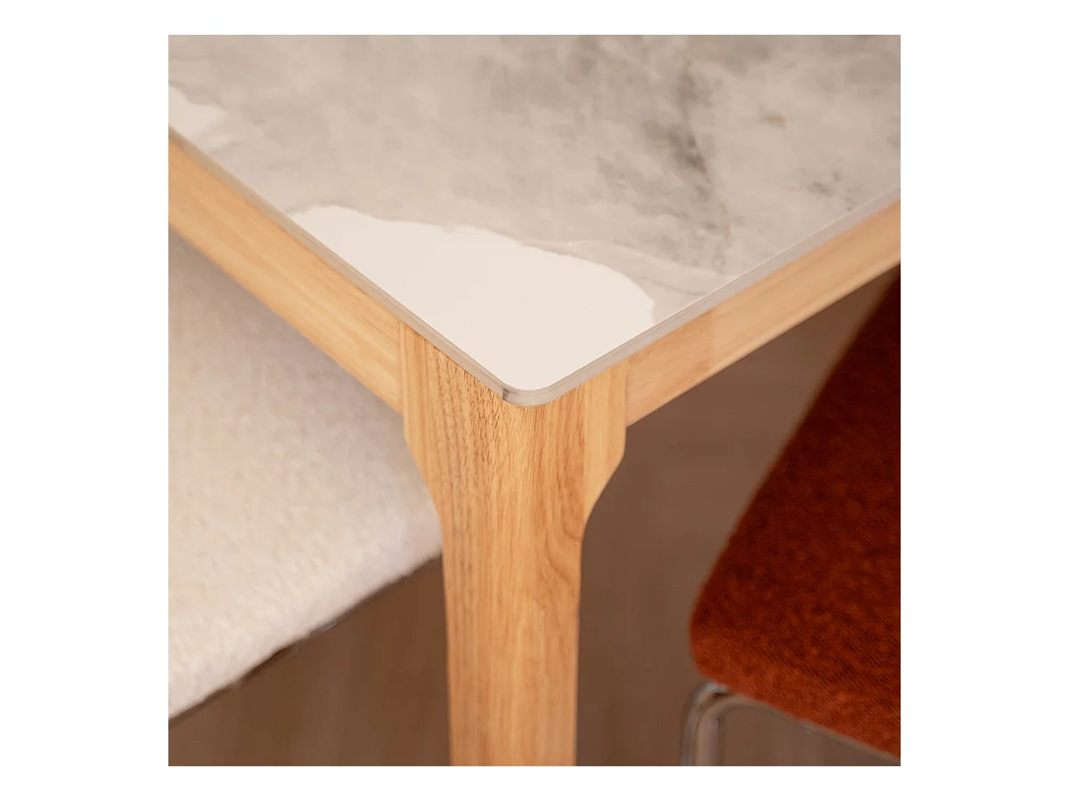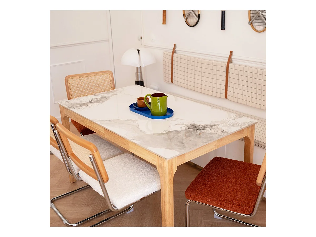 Table à manger en céramique effet pierre blanche 6 personnes, piètement bois 140 cm - Sally