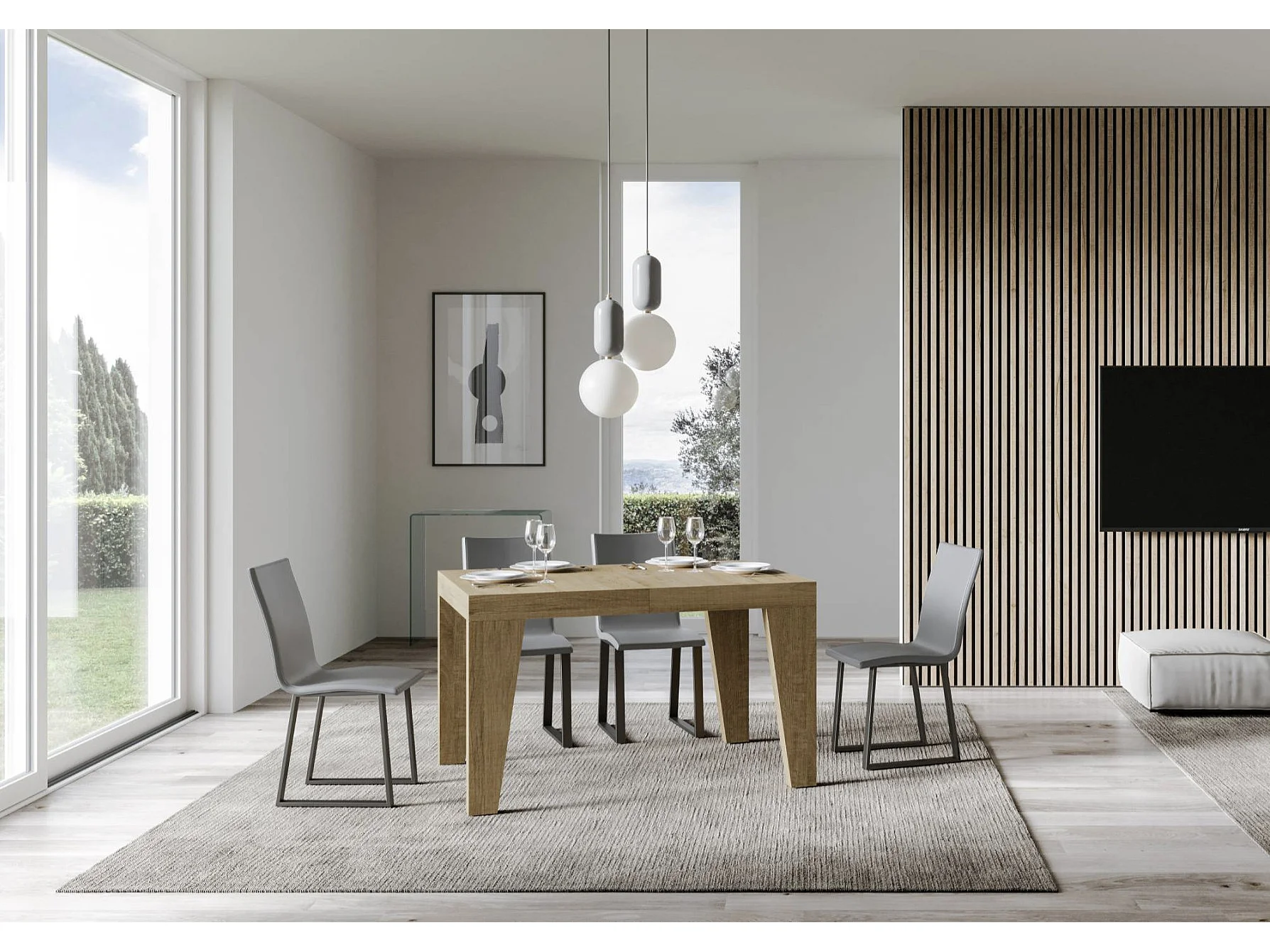 Table à manger extensible bois Naxo-Couleur Naturel-4 pieds-2 rallonges fines-130 à 234cm