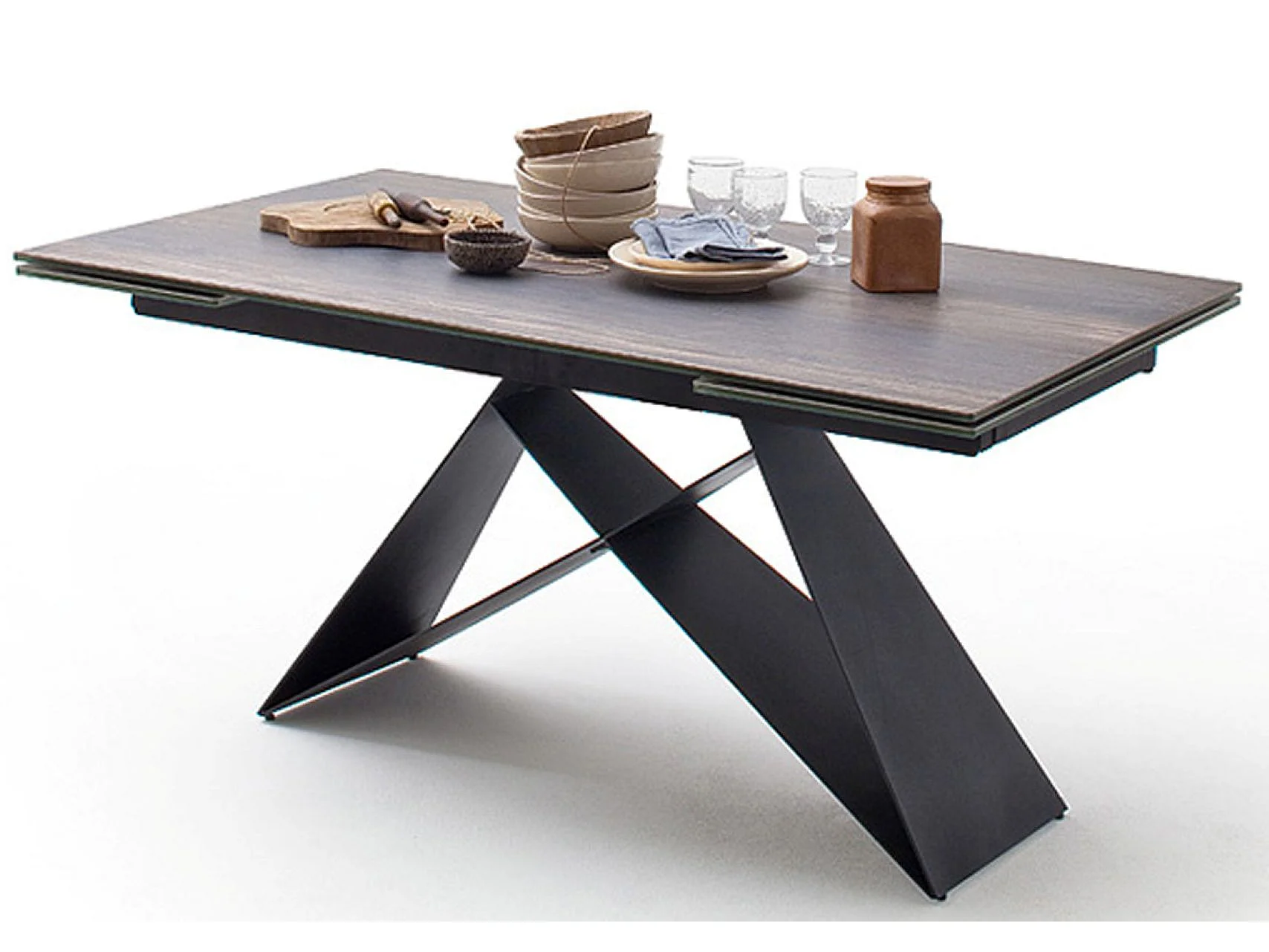 Table à manger extensible en métal noir mat et surface céramique aspect bois barrique - L.160-240 x H.75 x P.90 cm
