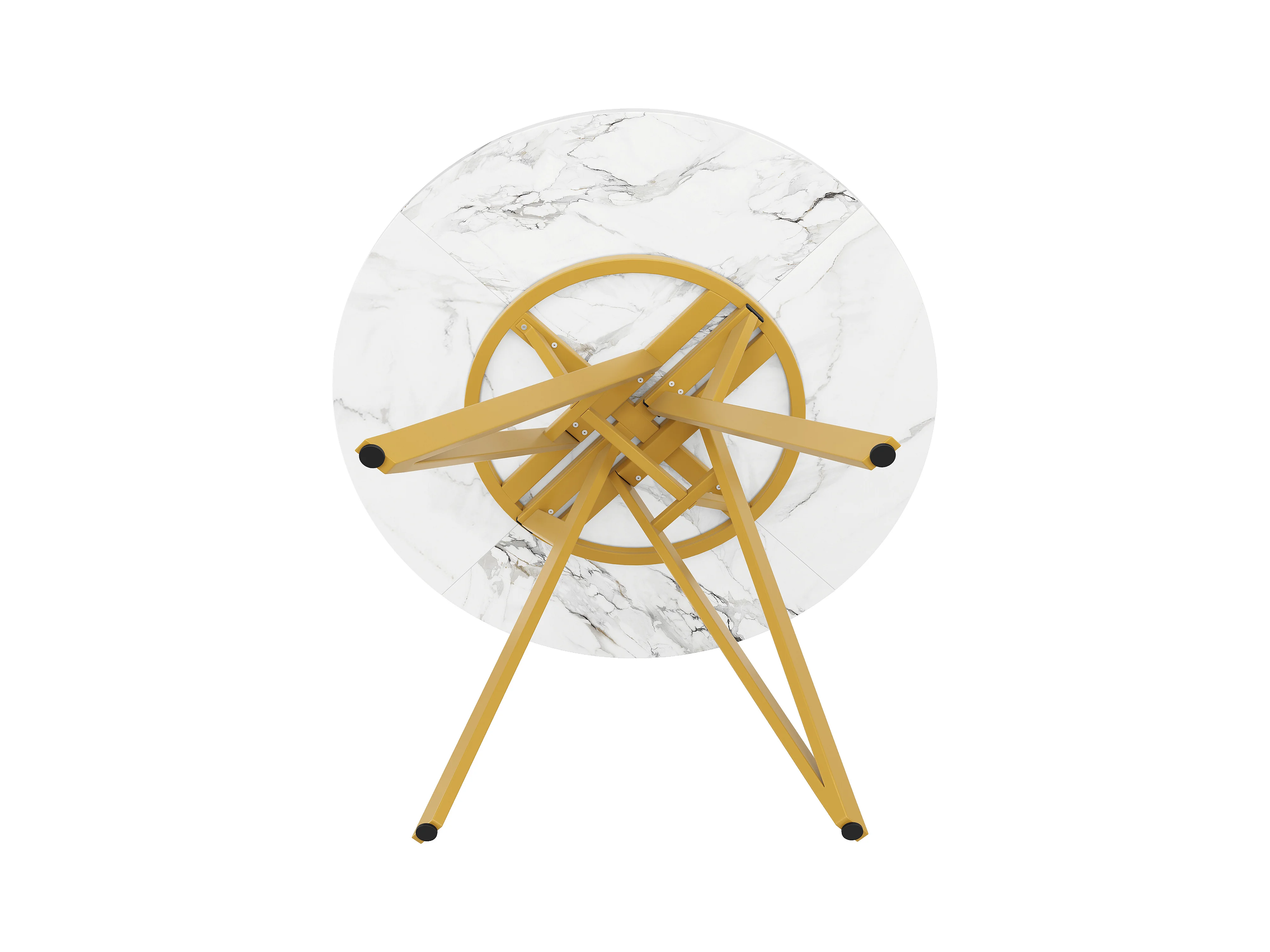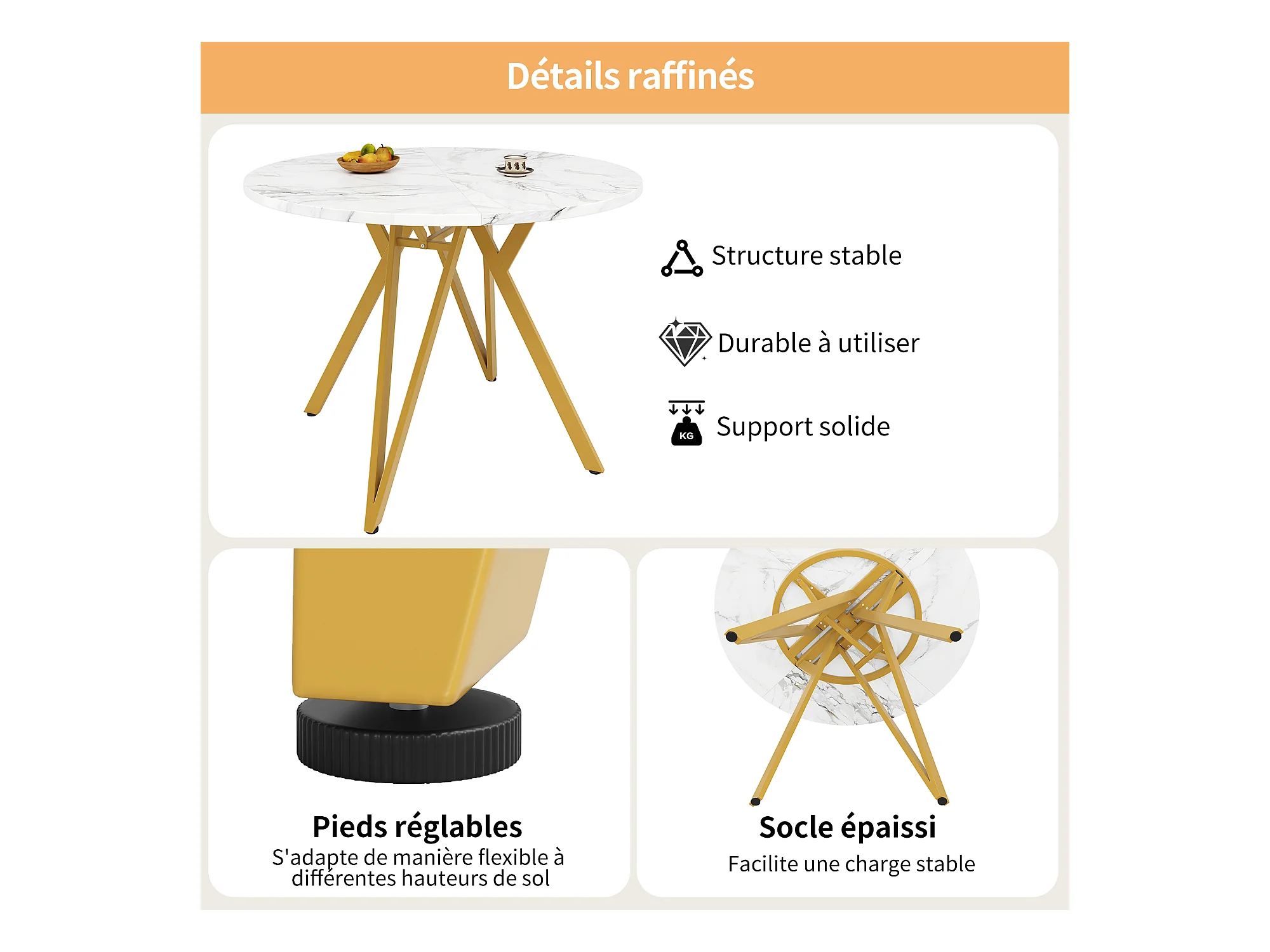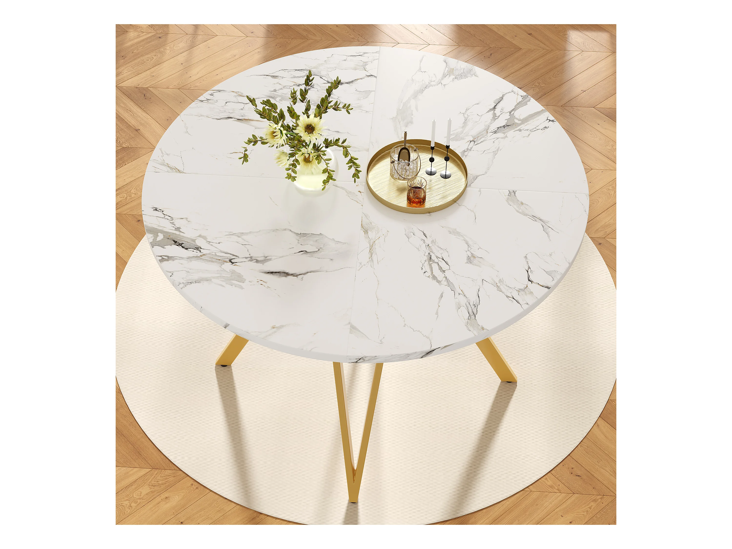 Table à manger ronde 100x100x76cm avec plateau en placage marbre blanc, pieds en métal doré réglable