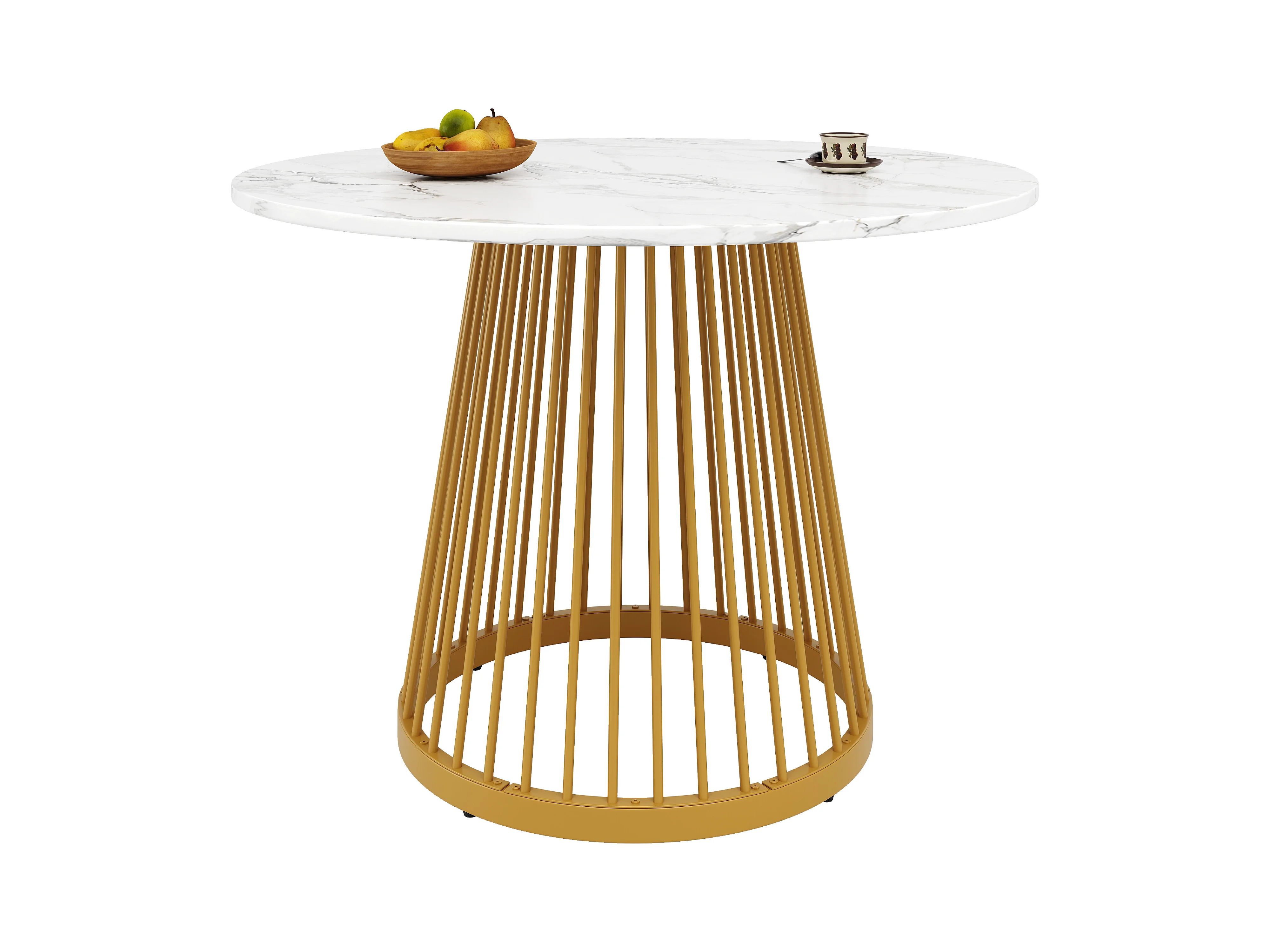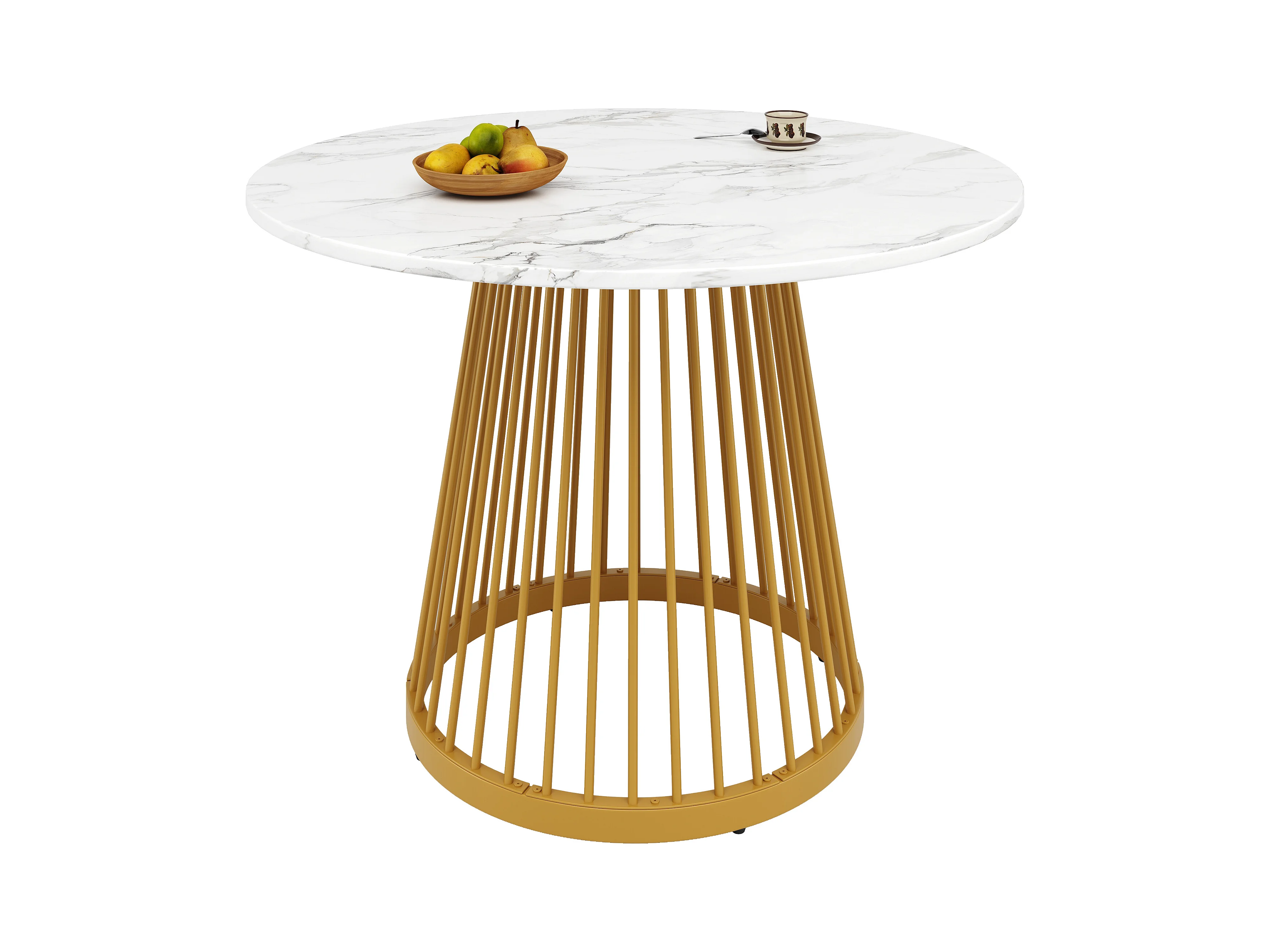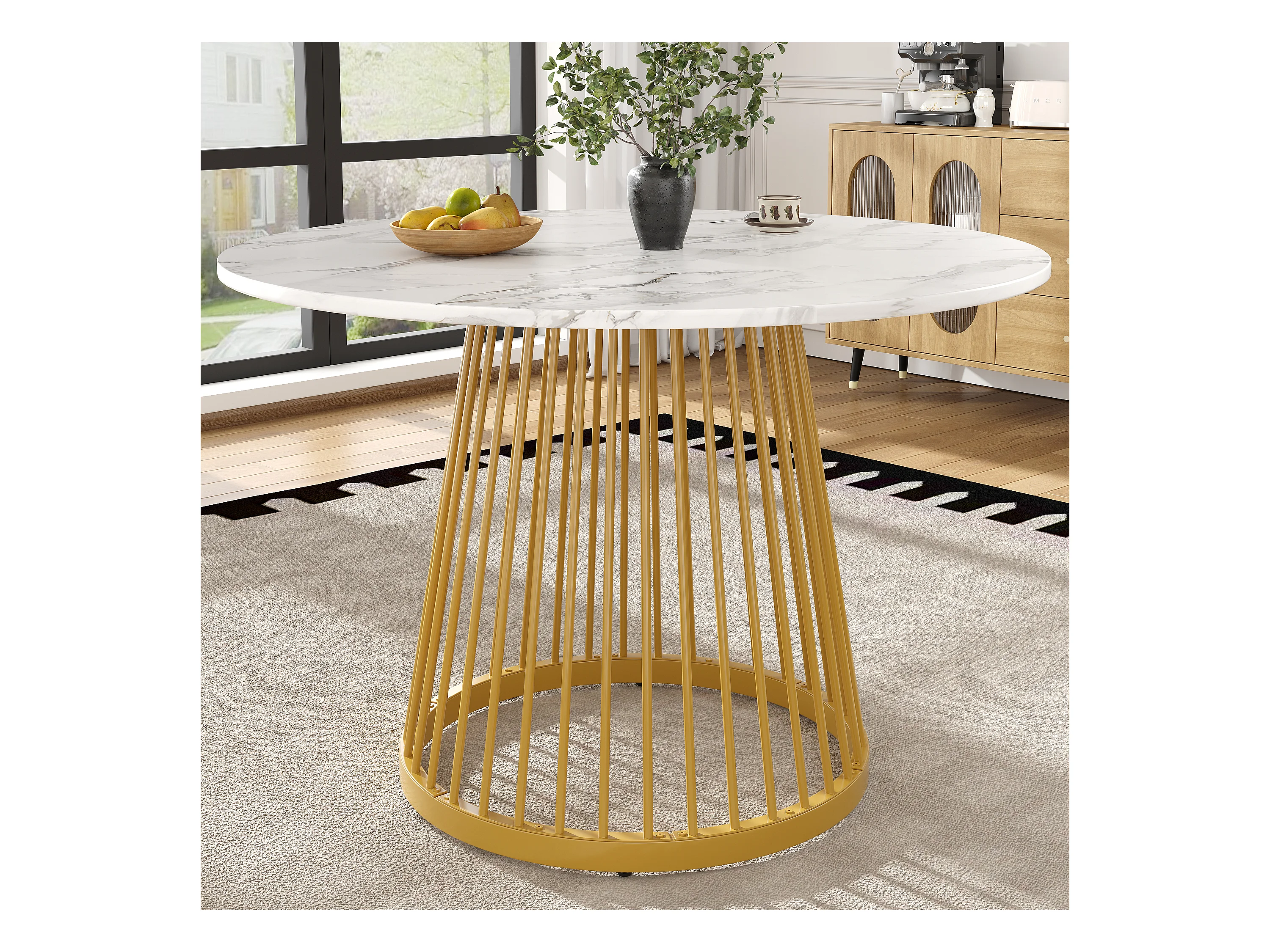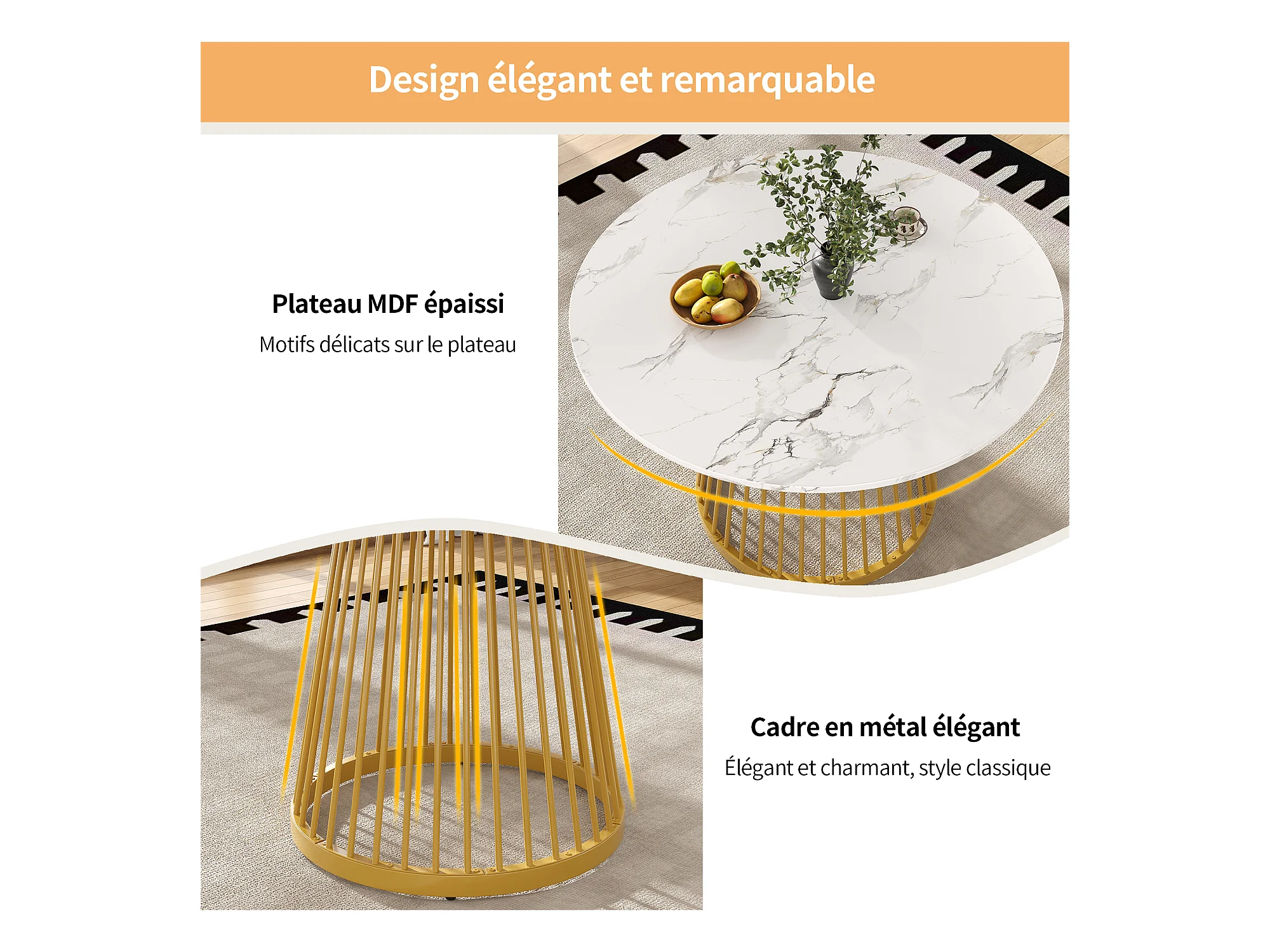 Table à manger ronde 100x100x76cm 4 personnes avec plateau en placage marbre blanc, cadre en métal doré