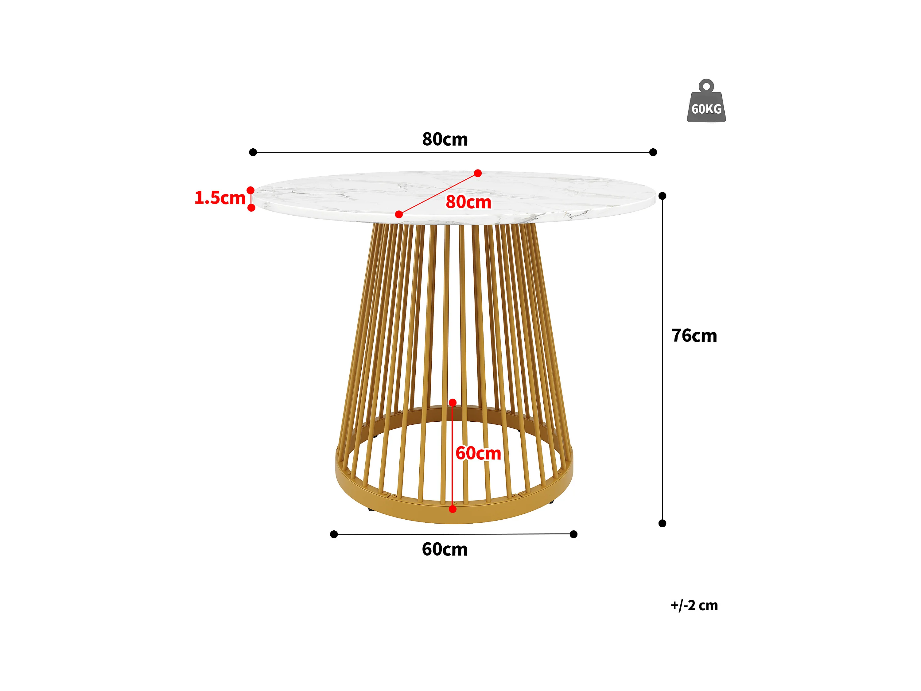 Table à manger ronde 80x80x76cm avec plateau en placage marbre blanc, cadre en métal doré