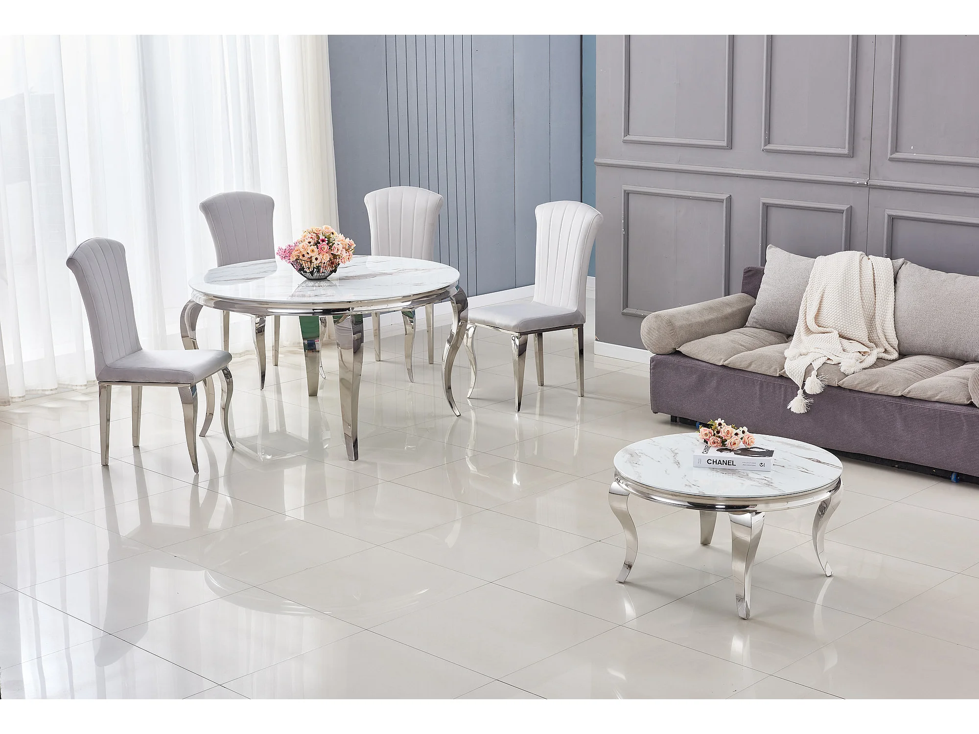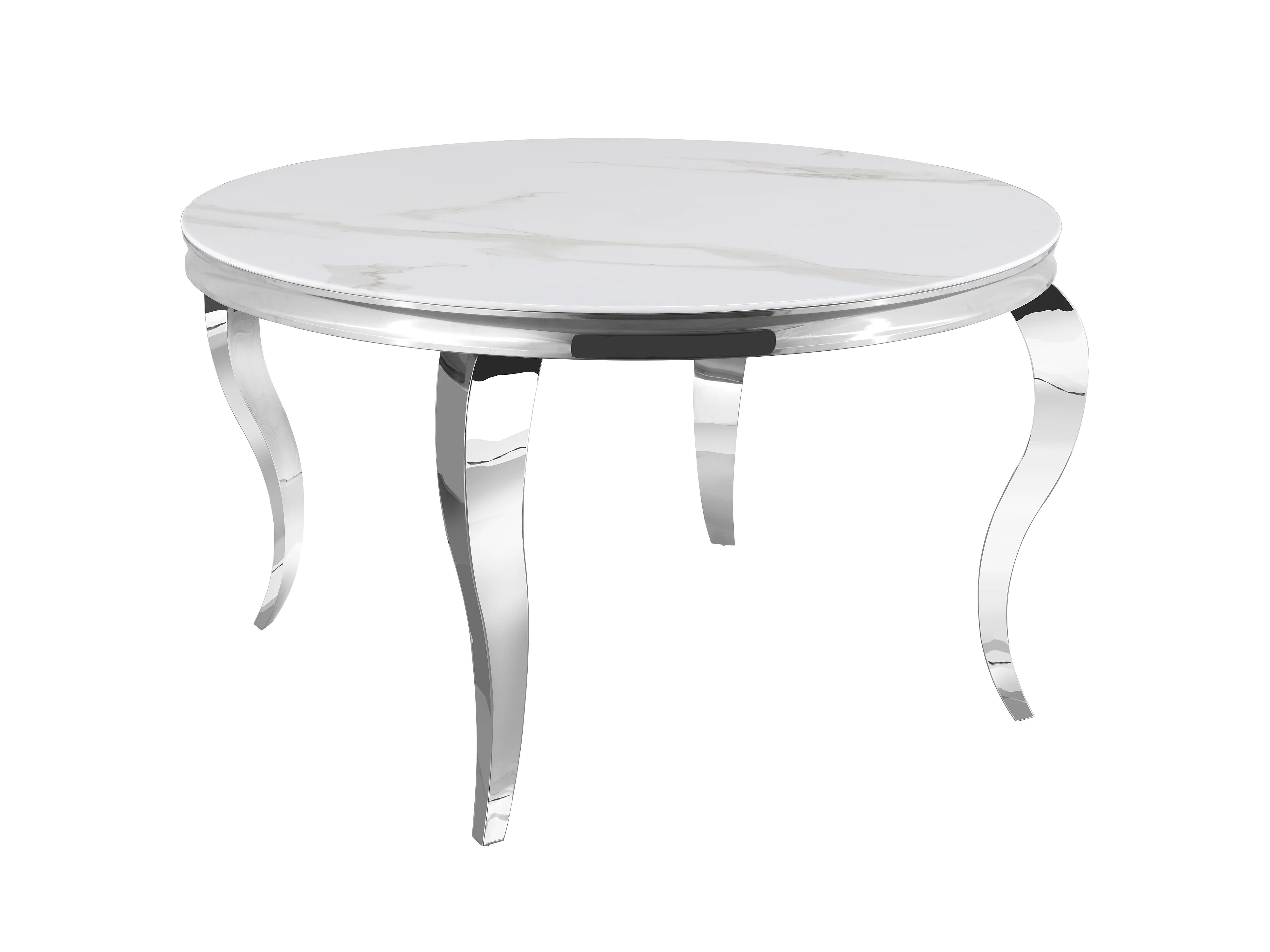 Table à manger ronde BAROQUE MARBRE BLANC pieds chrome 130x75 cm