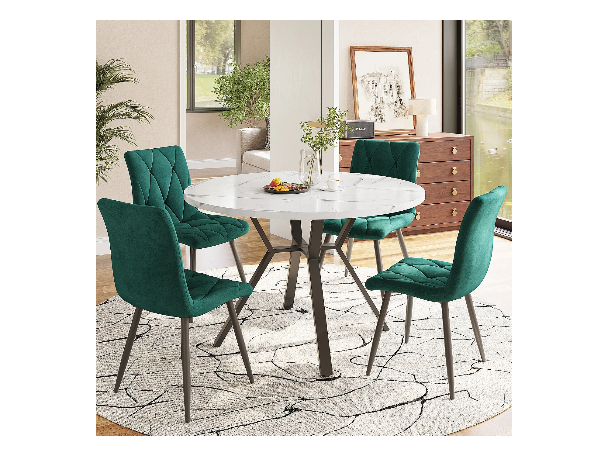 Table à manger ronde blanche - Table à manger avec support métallique en forme de X et repose-pieds noir - pour salle à manger et salon