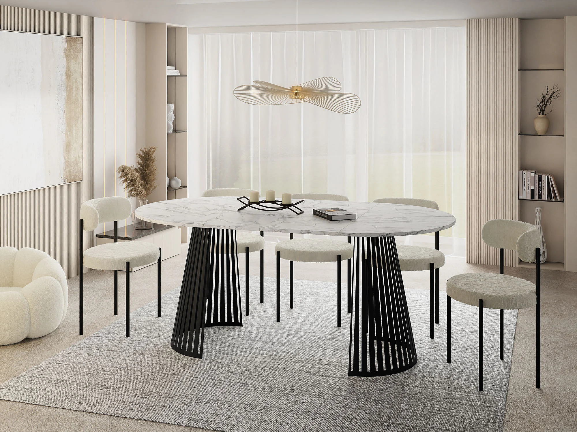 Table à Manger Ronde Extensible avec Lamelles Style Loft 120 cm – Design Industriel avec Pieds en Métal Noir, Gain de Place pour Salon – Marbre Blanc