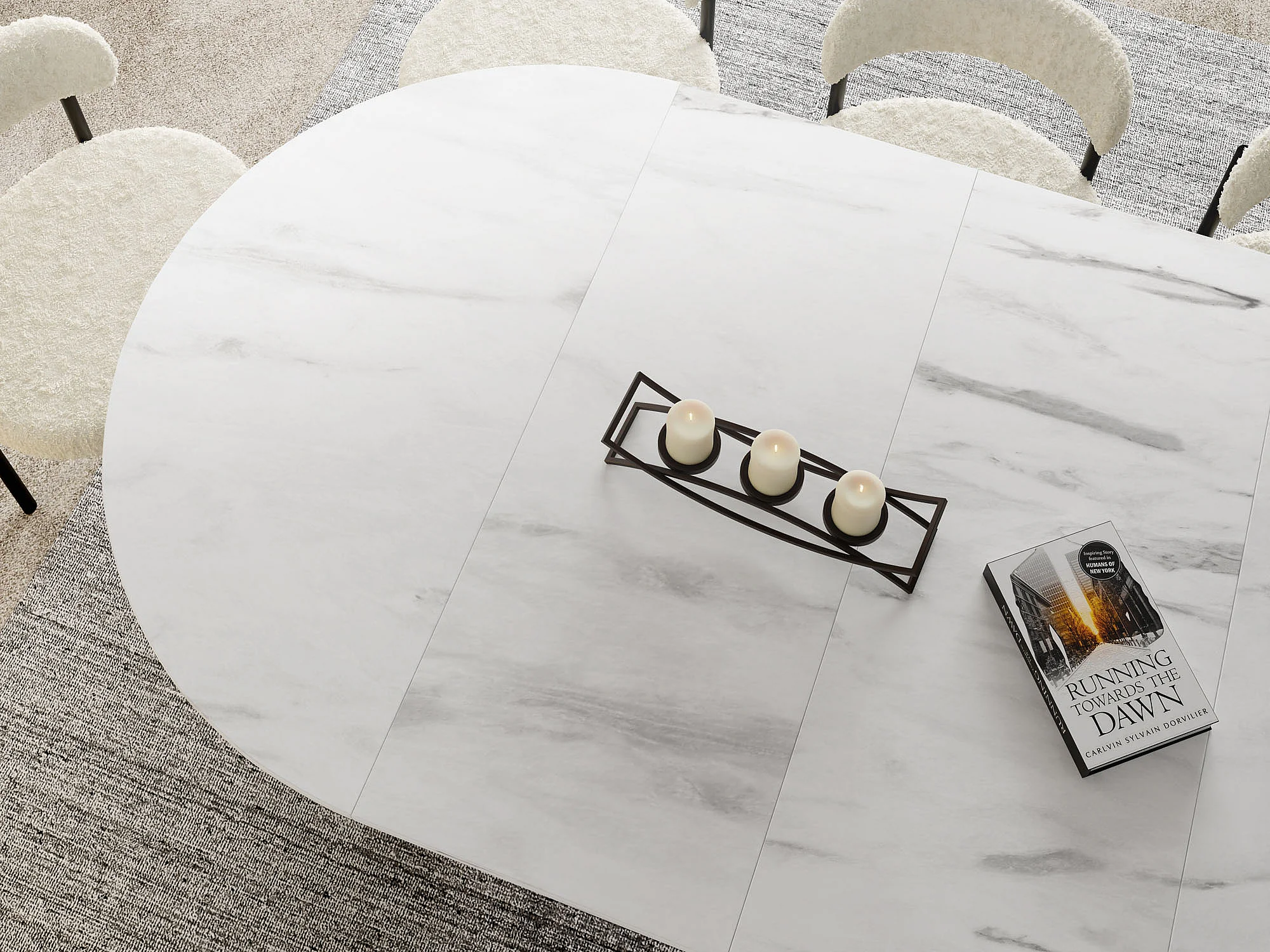 Table à Manger Ronde Extensible Loft – 120 à 200 cm – Table Industrielle avec Pieds en Métal Coniques Noirs pour 6 à 10 Personnes – Gain de Place – Marbre Blanc