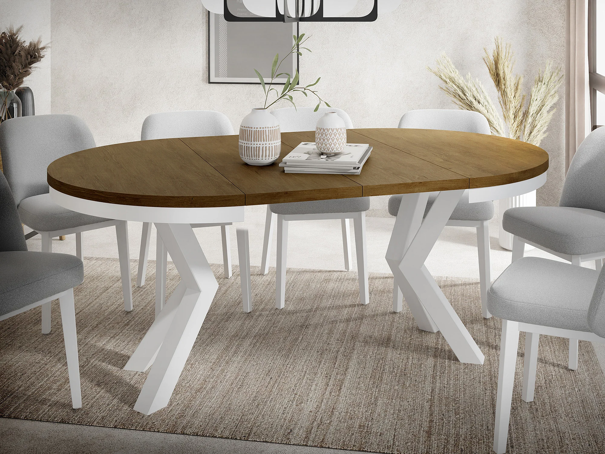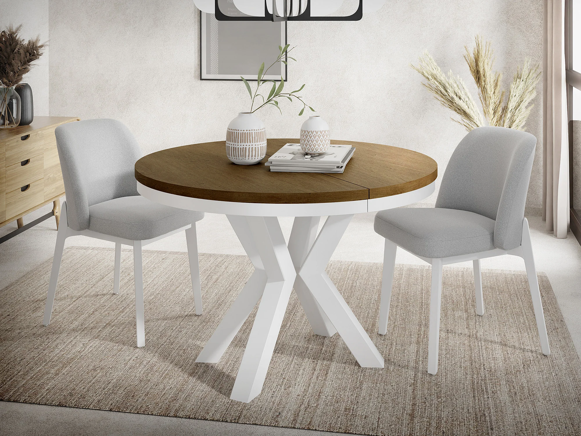 Table à Manger Ronde Extensible Style Loft - Table avec Pieds Métalliques Blancs - Table Gain de Place pour Salon - Chêne Lefkas - 100 à 180 cm
