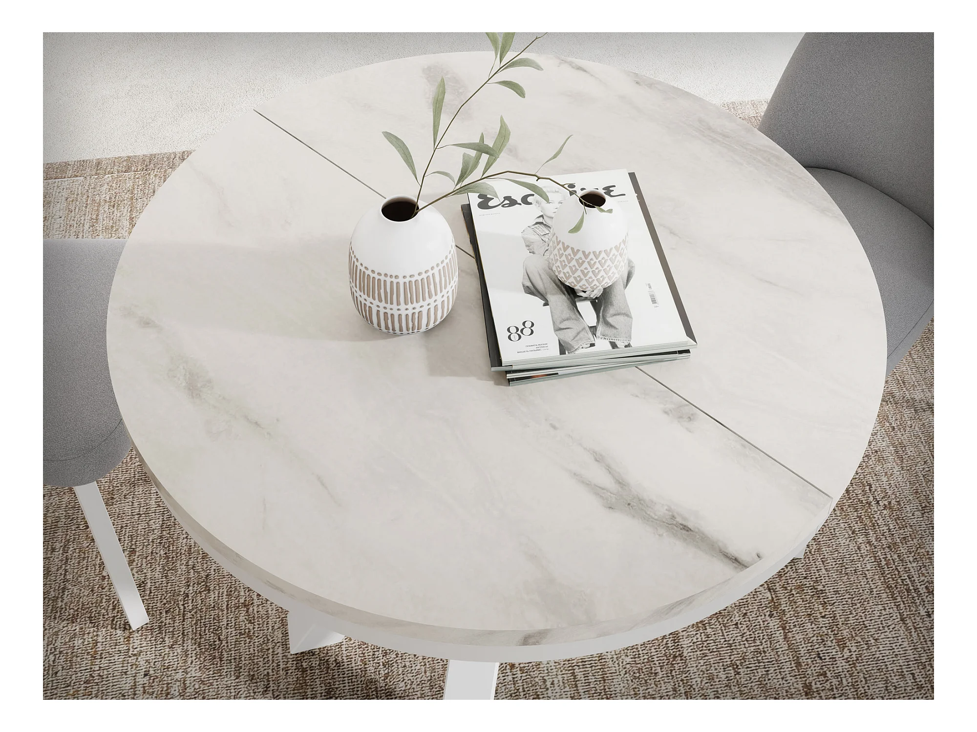 Table à Manger Ronde Extensible Style Loft - Table avec Pieds Métalliques Blancs - Table Gain de Place pour Salon - Marbre Blanc - 120 à 200 cm