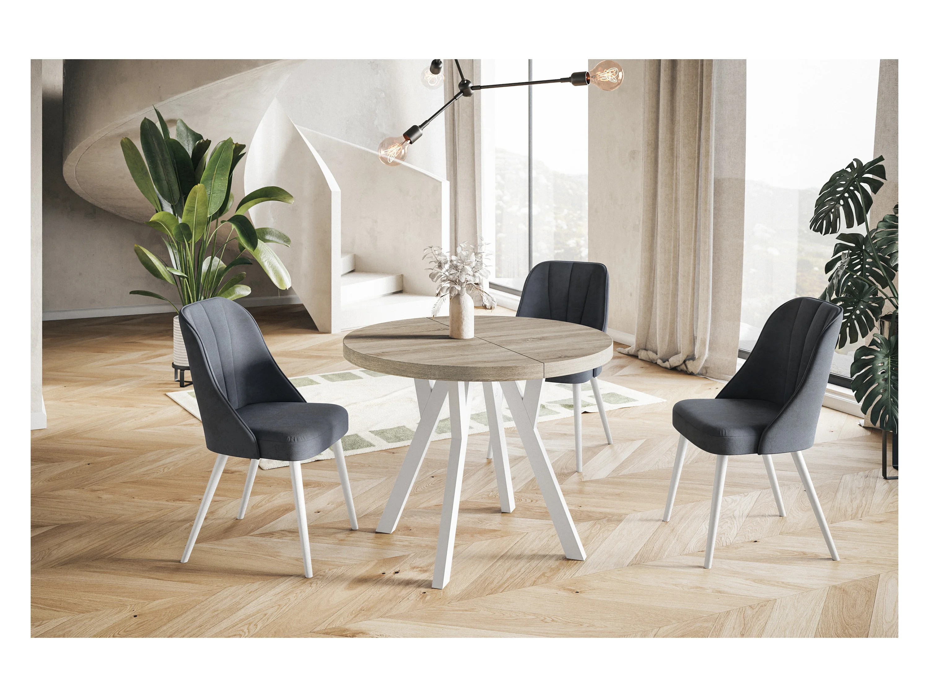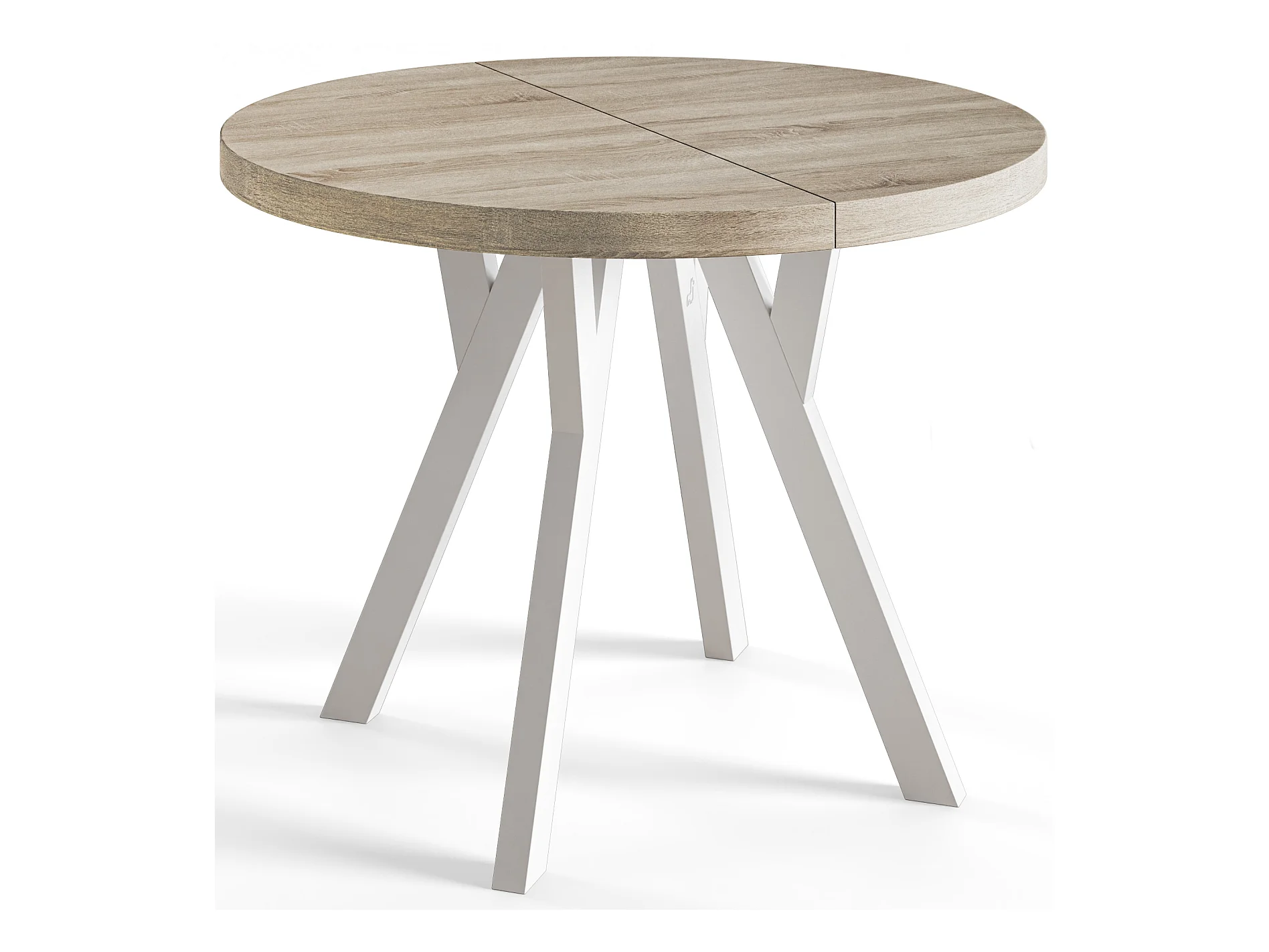 Table à manger ronde OVO, table à rallonges Diamètre : 120 cm à 220 cm, couleur de la table basse : SONOMA, avec pieds en bois blanc