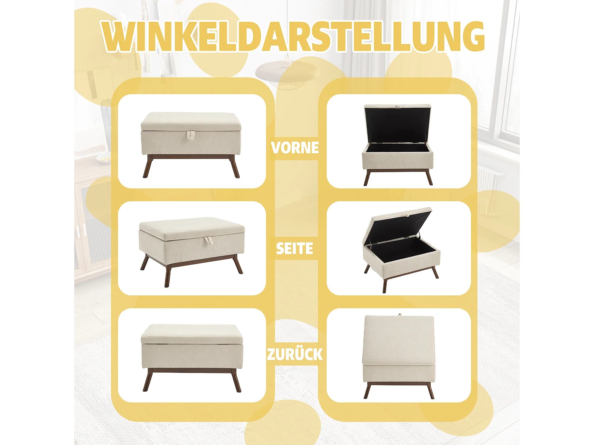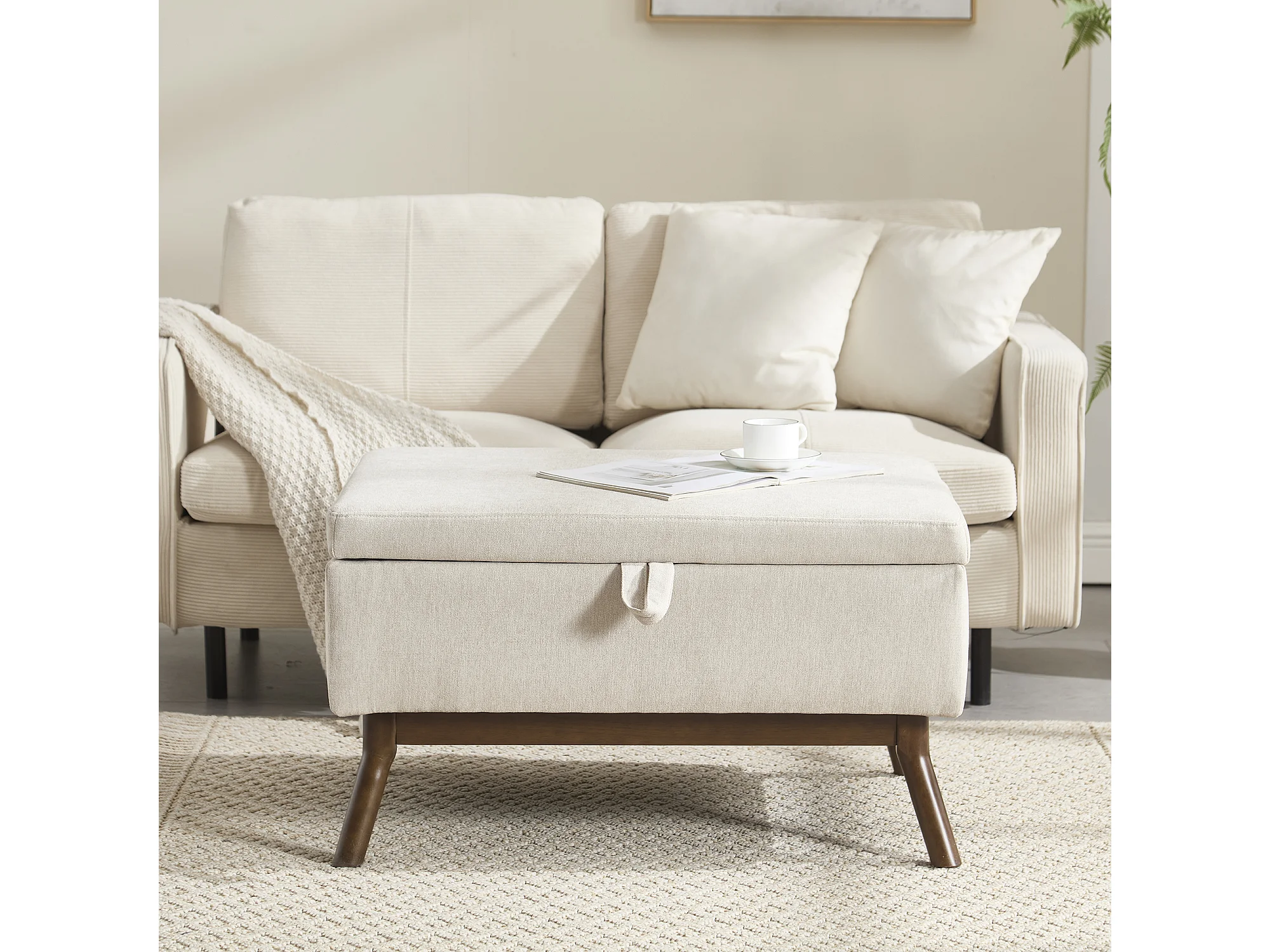 Table basique moderne style mid-century, multifonctionnelle avec rangement, bois massif et tissu lin, beige (80x59x45cm)