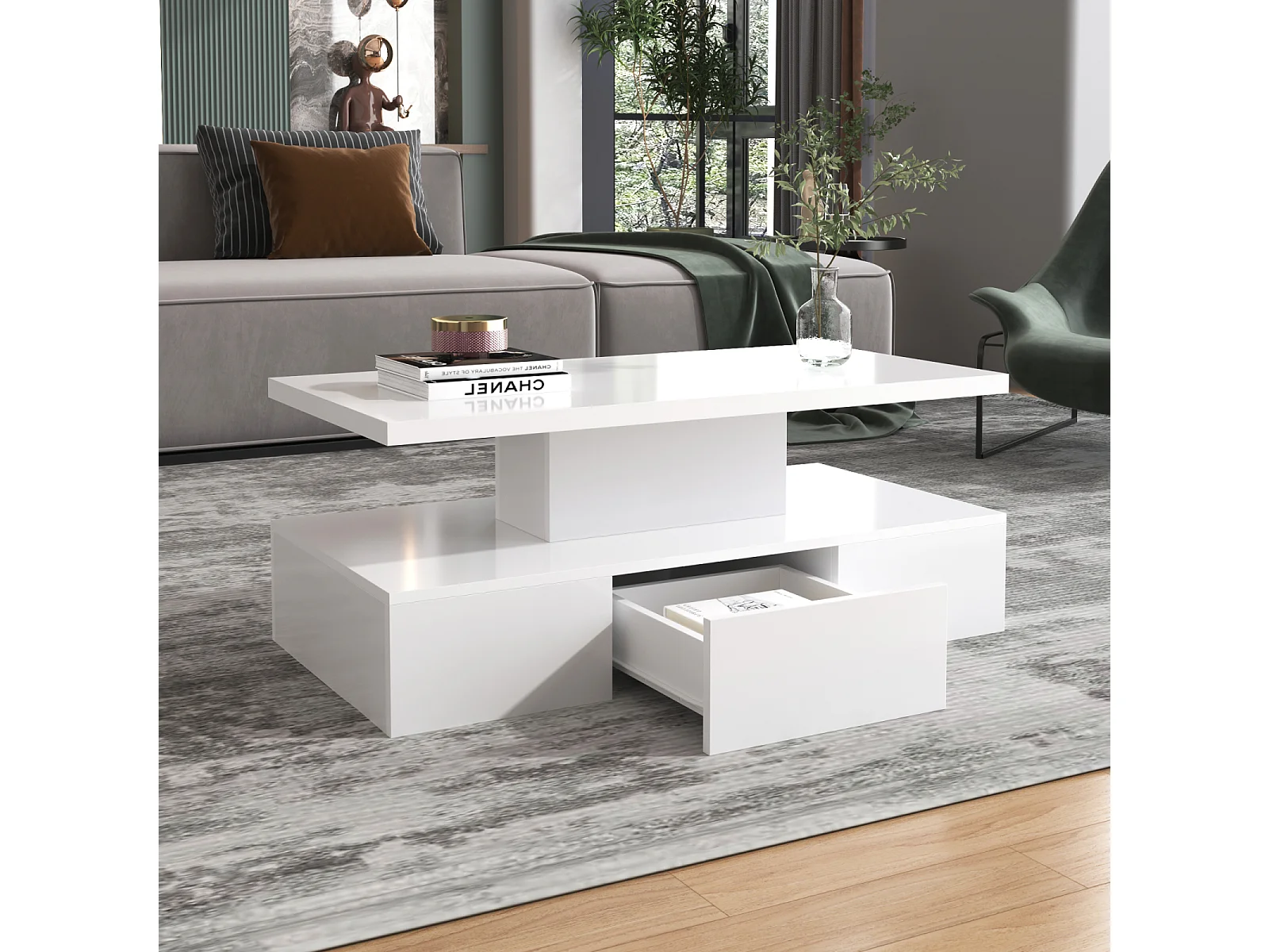 Table basse 100x50x31cm, table de salon haute brillance avec structure de rangement push-pull, tiroirs double face, blanc
