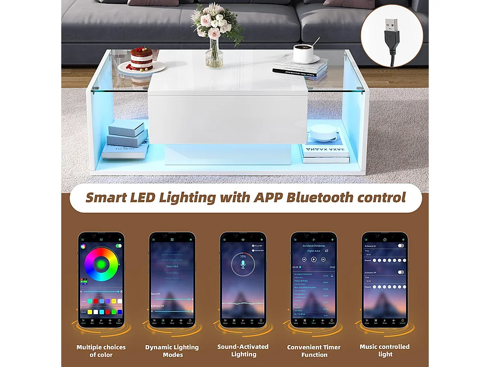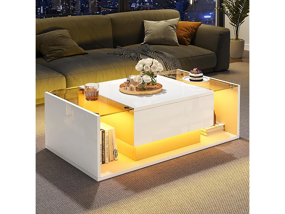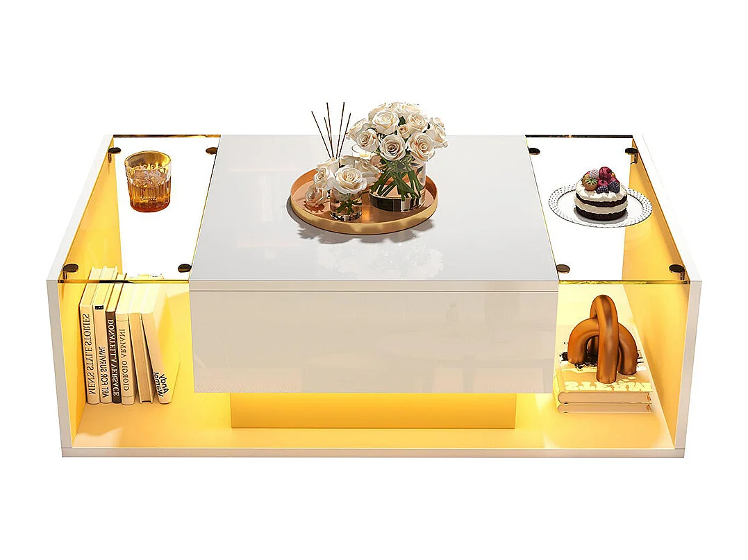 Table basse blanc brillant avec éclairage LED connecté et rangements intelligents